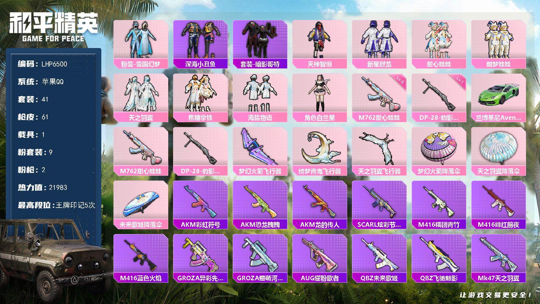 [15579119]【店主推荐捡漏号!可直接换绑】苹果 手Q-9粉装-2特效枪-1载具-3粉色飞行器-21983热力值-5王牌印记-41套装-61枪皮【热门品类】:粉装-雪国幻梦,套装-深海小丑鱼,套装-暗影【粉色套装】:粉装-雪国幻梦,粉装-天禅智恒,粉装-新星烈龙,粉装-甜心娃娃,粉装-酣梦娃娃,粉装-天之羽翼,粉装-焦糖拿铁,粉装-海盐物语,角色-白兰星【粉色枪皮等级】:M762-甜心娃娃(五级),DP-28-豹影疾电(一级)【粉色载具】:兰博基尼Aventador SVJ(翡翠绿)【粉色枪皮】:M762-甜心娃娃,DP-28-豹影疾电【粉色飞行器】:梦幻火箭飞行器,绮梦青鸾飞行器,天之羽翼飞行器