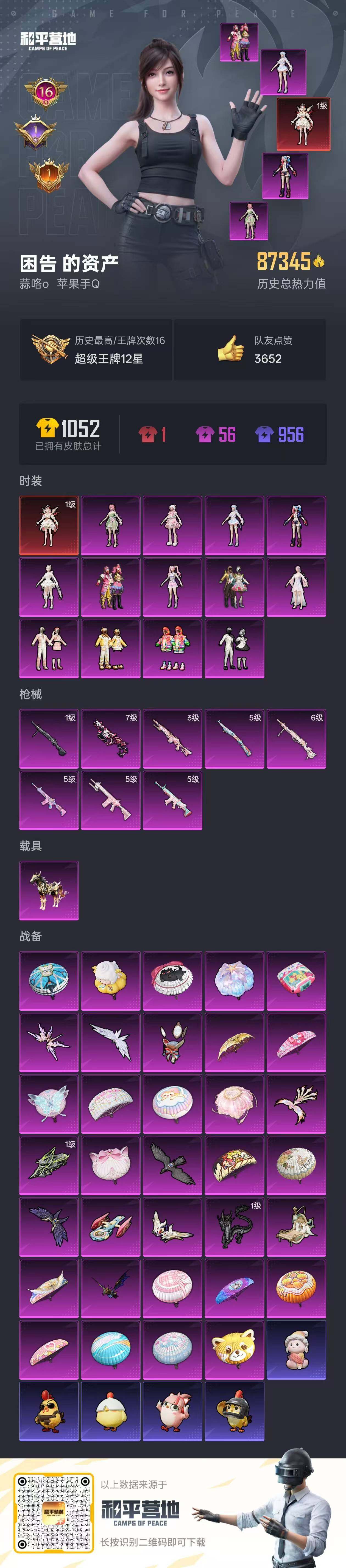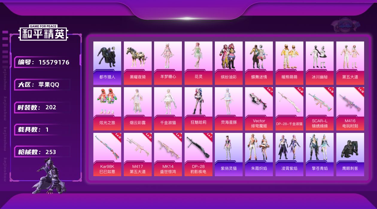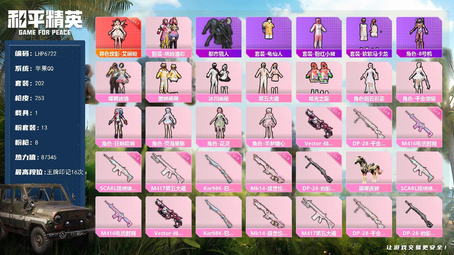 [15579176]【店主推荐捡漏号!可直接换绑】 苹果 手Q-1神装-13粉装-8特效枪-1载具-12粉色飞行器-87345热力值-16王牌印记-202套装-253枪皮【红色神装等级】:暮色玫影-艾丽娅(一级)【红色角色神装】:暮色玫影-艾丽娅【热门品类】:粉装-缤纷油彩,套装-都市猎人,套装-龟仙人,套装-粉红小猪,套装-软软马卡龙,角色-8号机【粉色套装】:粉装-蝶舞迷情,粉装-缤纷油彩,粉装-暖熊萌萌,粉装-冰川幽秘,粉装-第五大道,粉装-炫光之旅,角色-烟云彩露,角色-千金淑猫,角色-狂魅哈莉,角色-荧海星豚,角色-花灵,角色-羊梦糖心【粉色枪皮等级】:SCAR-L-锦绣绵绵(五级),M416-电玩时刻(五级),Vector-绯穹魔姬(七级),Kar98K-巳巳如意(五级),Mk14-盛世惊鸿(三级),M417-第五大道(五级),DP-28-千金淑猫(六级),DP-28-豹影疾电(一级)【粉色载具】:黑曜夜骑【粉色枪皮】:SCAR-L-锦绣绵绵,M416-电玩时刻,Vector-绯穹魔姬,Kar98K-巳巳如意,Mk14-盛世惊鸿,M417-第五大道,DP-28-千金淑猫,DP-28-豹影疾电【粉色飞行器】:星夜魔法师飞行翼,镜光幻境飞行翼,繁龙极客飞行器,绝色倾城飞行器,星空武士飞行器,龙翔九天飞行器,英伦信使飞行器,幽焰列车飞行器,凤舞九天飞行器,绯果甜心飞行器,终晖之翼飞行器