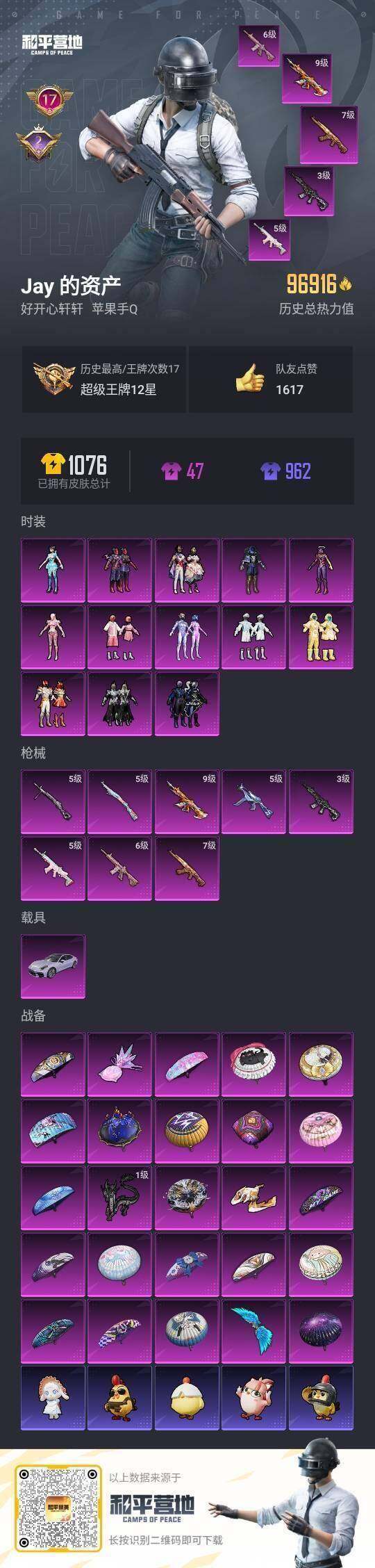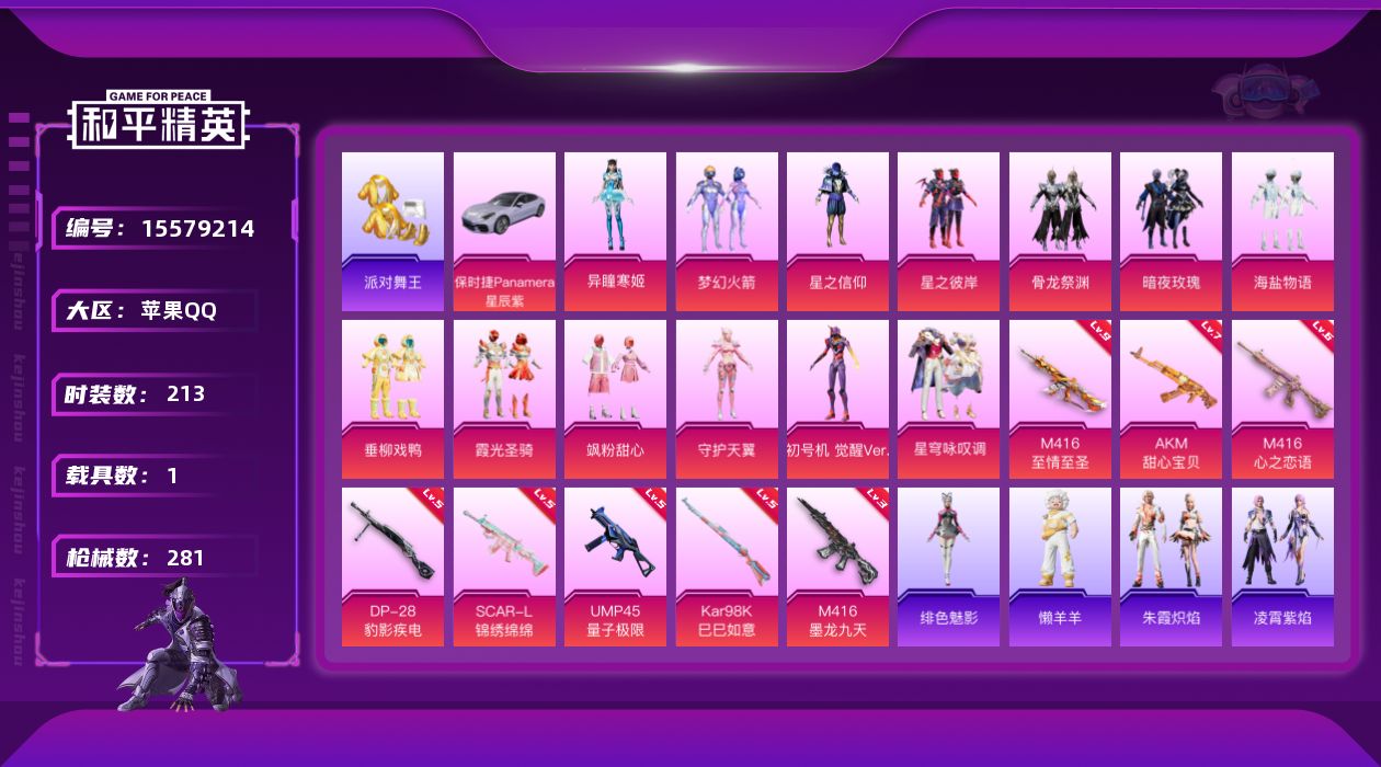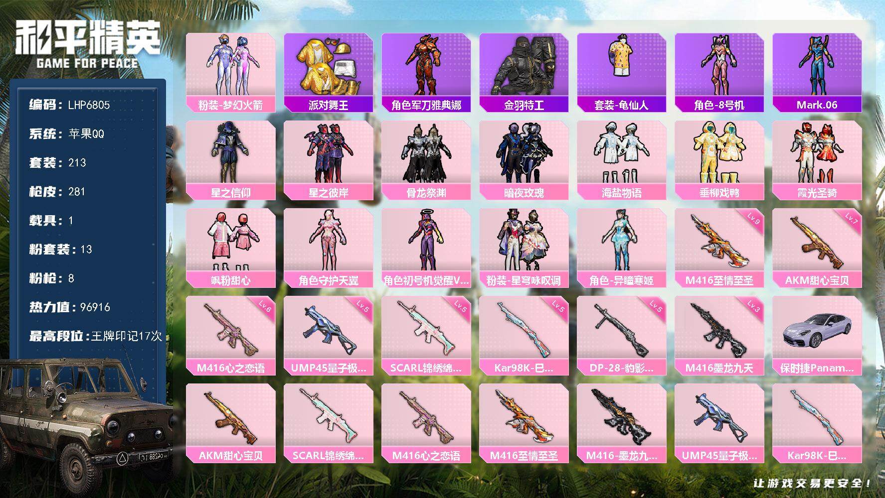 [15579214]【特价出售/店主推荐】苹果 手Q-13粉装-8特效枪-1载具-4粉色飞行器-96916热力值-17王牌印记-213套装-281枪皮【热门品类】:粉装-梦幻火箭,套装-派对舞王,角色-军刀雅典娜,套装-金羽特工,套装-龟仙人,角色-8号机,角色-Mark.06【粉色套装】:粉装-梦幻火箭,粉装-星之信仰,粉装-星之彼岸,粉装-骨龙祭渊,粉装-暗夜玫瑰,粉装-海盐物语,粉装-垂柳戏鸭,粉装-霞光圣骑,粉装-飒粉甜心,角色-守护天翼,角色-初号机 觉醒Ver.,粉装-星穹咏叹调,角色-异瞳寒姬【粉色枪皮等级】:AKM-甜心宝贝(七级),SCAR-L-锦绣绵绵(五级),M416-心之恋语(六级),M416-至情至圣(九级),M416-墨龙九天(三级),UMP45-量子极限(五级),Kar98K-巳巳如意(五级),DP-28-豹影疾电(五级)【粉色载具】:保时捷Panamera(星辰紫)【粉色枪皮】:AKM-甜心宝贝,SCAR-L-锦绣绵绵,M416-心之恋语,M416-至情至圣,M416-墨龙九天,UMP45-量子极限,Kar98K-巳巳如意,DP-28-豹影疾电【粉色飞行器】:拂晓神骑飞行器,龙翔九天飞行器