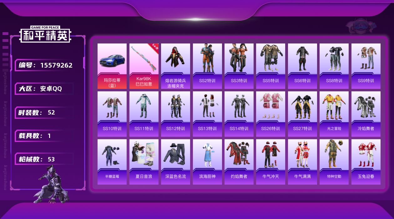 [15579262]【特价出售/店主推荐】 安卓 手Q-0粉装-1特效枪-1载具-0粉色飞行器-17773热力值-1王牌印记-52套装-53枪皮【热门品类】:熔岩游骑兵连帽夹克【粉色枪皮等级】:Kar98K-巳巳如意(五级)【粉色载具】:玛莎拉蒂Ghibli(蓝)【粉色枪皮】:Kar98K-巳巳如意