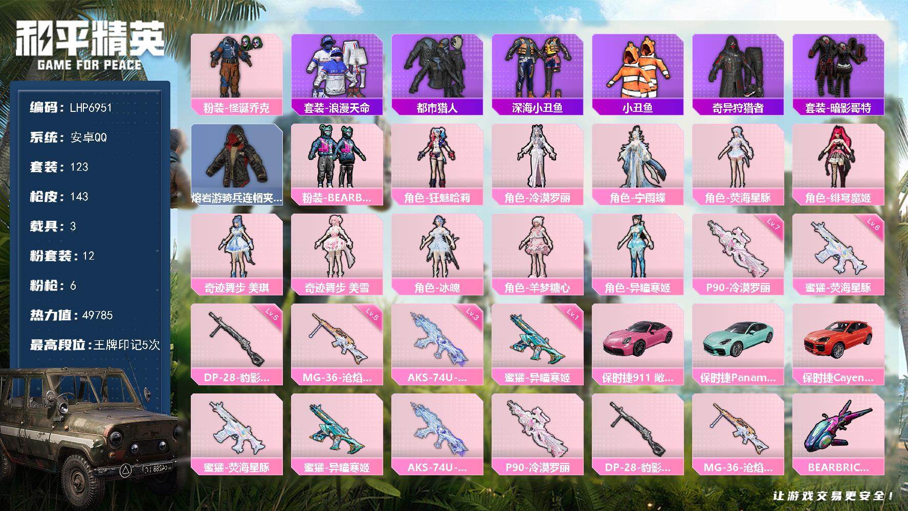 [15579277]【特价出售/店主推荐】 安卓 手Q-12粉装-6特效枪-3载具-3粉色飞行器-49785热力值-5王牌印记-123套装-143枪皮【热门品类】:粉装-怪诞乔克,套装-浪漫天命,套装-都市猎人,套装-深海小丑鱼,套装-小丑鱼,套装-奇异狩猎者,套装-暗影哥特,熔岩游骑兵连帽夹克【粉色套装】:粉装-怪诞乔克,粉装-BEARBRICK,角色-狂魅哈莉,角色-冷漠罗丽,角色-宁雨蝶,角色-荧海星豚,角色-绯穹魔姬,角色-奇迹舞步 美琪,角色-奇迹舞步 美雪,角色-冰魄,角色-羊梦糖心,角色-异瞳寒姬【粉色枪皮等级】:蜜獾-荧海星豚(六级),蜜獾-异瞳寒姬(一级),AKS-74U-无垠阁(三级),P90-冷漠罗丽(七级),DP-28-豹影疾电(五级),MG-36-沧焰双生(五级)【粉色载具】:保时捷911 敞篷版(星珀红),保时捷Panamera(梦幻青),保时捷Cayenne(激情红)【粉色枪皮】:蜜獾-荧海星豚,蜜獾-异瞳寒姬,AKS-74U-无垠阁,P90-冷漠罗丽,DP-28-豹影疾电,MG-36-沧焰双生【粉色飞行器】:BEARBRICK飞行器