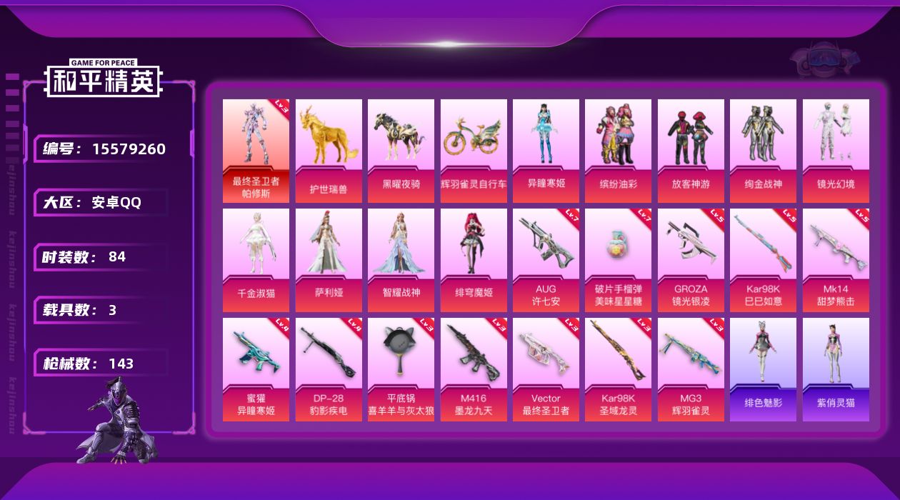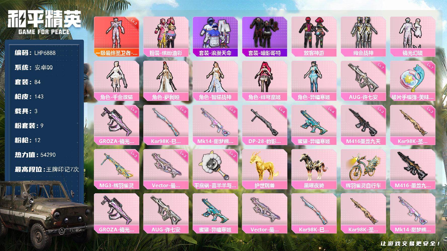 [15579260]【特价出售/店主推荐】安卓 手Q-1神装-9粉装-12特效枪-3载具-7粉色飞行器-54290热力值-7王牌印记-84套装-143枪皮【红色神装等级】:最终圣卫者-帕修斯(三级)【红色角色神装】:最终圣卫者-帕修斯【热门品类】:粉装-缤纷油彩,套装-浪漫天命,套装-暗影哥特【粉色套装】:粉装-缤纷油彩,粉装-放客神游,粉装-绚金战神,粉装-镜光幻境,角色-千金淑猫,角色-萨利娅,角色-智耀战神,角色-绯穹魔姬,角色-异瞳寒姬【粉色枪皮等级】:M416-墨龙九天(三级),GROZA-镜光银凌(五级),AUG-许七安(七级),蜜獾-异瞳寒姬(四级),Vector-最终圣卫者(三级),Kar98K-巳巳如意(五级),Kar98K-圣域龙灵(三级),Mk14-甜梦熊击(五级),DP-28-豹影疾电(四级),MG3-辉羽雀灵(三级),平底锅-喜羊羊与灰太狼(三级),破片手榴弹-美味星星糖(七级)【粉色载具】:护世瑞兽,黑曜夜骑,辉羽雀灵自行车【粉色枪皮】:M416-墨龙九天,GROZA-镜光银凌,AUG-许七安,蜜獾-异瞳寒姬,Vector-最终圣卫者,Kar98K-巳巳如意,Kar98K-圣域龙灵,Mk14-甜梦熊击,DP-28-豹影疾电,MG3-辉羽雀灵,平底锅-喜羊羊与灰太狼,破片手榴弹-美味星星糖【粉色飞行器】:镜域双华-灵镜之阶,龙翔九天飞行器,圣域金龙飞行器,雀灵庇佑飞行器,终晖之翼飞行器