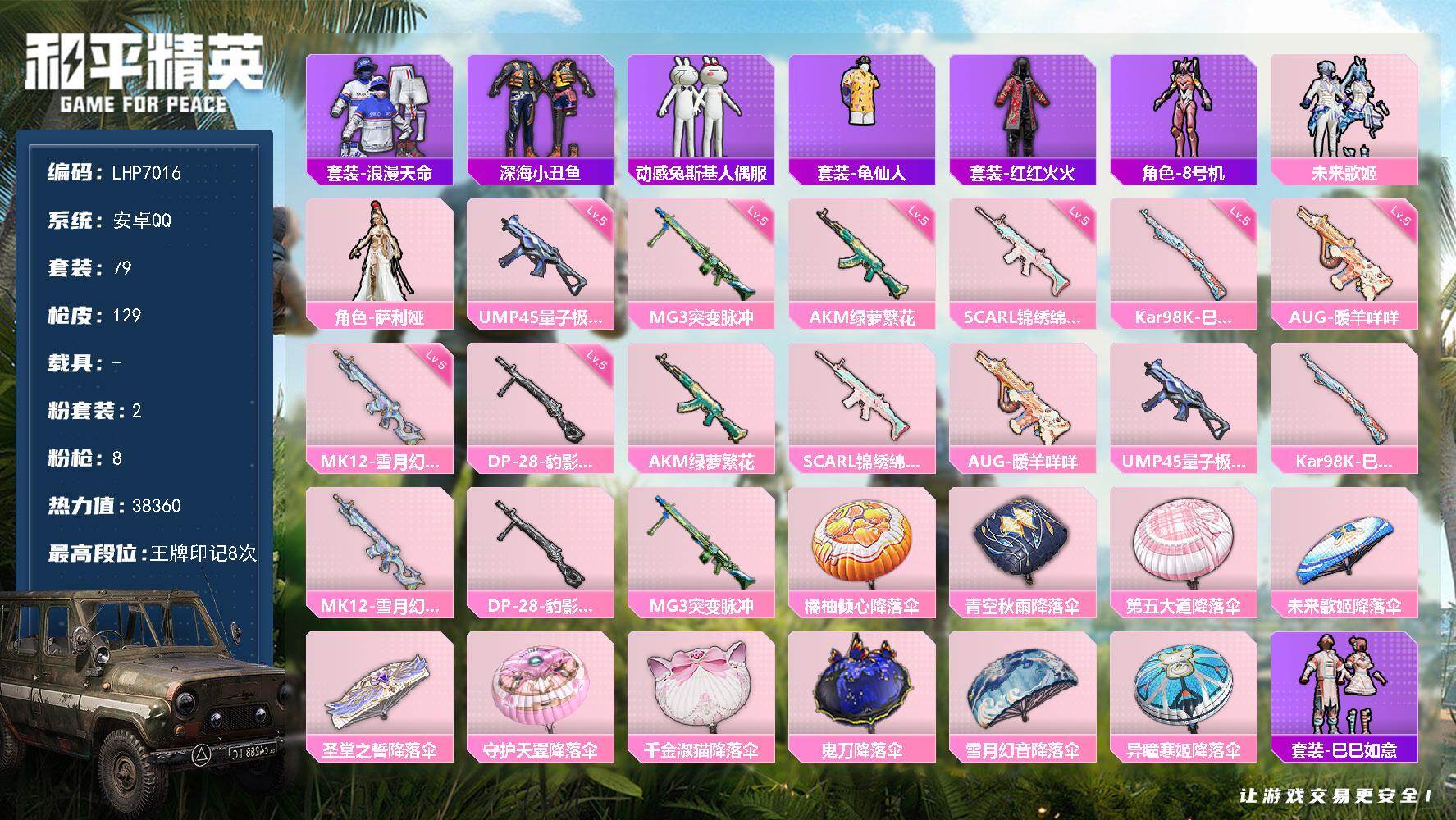 [15579306]【特价出售/店主推荐】安卓 手Q-2粉装-8特效枪-0载具-1粉色飞行器-38360热力值-8王牌印记-79套装-129枪皮【热门品类】:套装-浪漫天命,套装-深海小丑鱼,套装-动感兔斯基人偶服,套装-龟仙人,套装-红红火火,角色-8号机【粉色套装】:粉装-未来歌姬,角色-萨利娅【粉色枪皮等级】:AKM-绿萝繁花(五级),SCAR-L-锦绣绵绵(五级),AUG-暖羊咩咩(五级),UMP45-量子极限(五级),Kar98K-巳巳如意(五级),MK12-雪月幻音(五级),DP-28-豹影疾电(五级),MG3-突变脉冲(五级)【粉色枪皮】:AKM-绿萝繁花,SCAR-L-锦绣绵绵,AUG-暖羊咩咩,UMP45-量子极限,Kar98K-巳巳如意,MK12-雪月幻音,DP-28-豹影疾电,MG3-突变脉冲