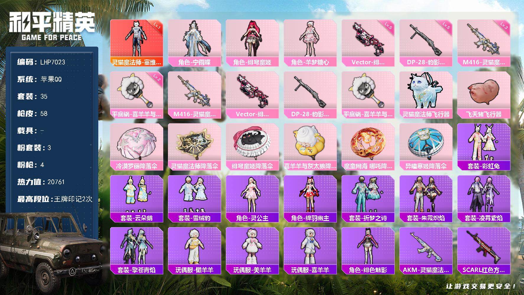 [15579323]【特价出售/店主推荐】苹果 手Q-1神装-3粉装-4特效枪-0载具-2粉色飞行器-20761热力值-2王牌印记-35套装-58枪皮【红色神装等级】:灵猫魔法师-塞维尔(一级)【红色角色神装】:灵猫魔法师-塞维尔【粉色套装】:角色-宁雨蝶,角色-绯穹魔姬,角色-羊梦糖心【粉色枪皮等级】:M416-灵猫魔法师(三级),Vector-绯穹魔姬(五级),DP-28-豹影疾电(五级),平底锅-喜羊羊与灰太狼(二级)【粉色枪皮】:M416-灵猫魔法师,Vector-绯穹魔姬,DP-28-豹影疾电,平底锅-喜羊羊与灰太狼【粉色飞行器】:灵猫魔法师飞行器,飞天猪飞行器