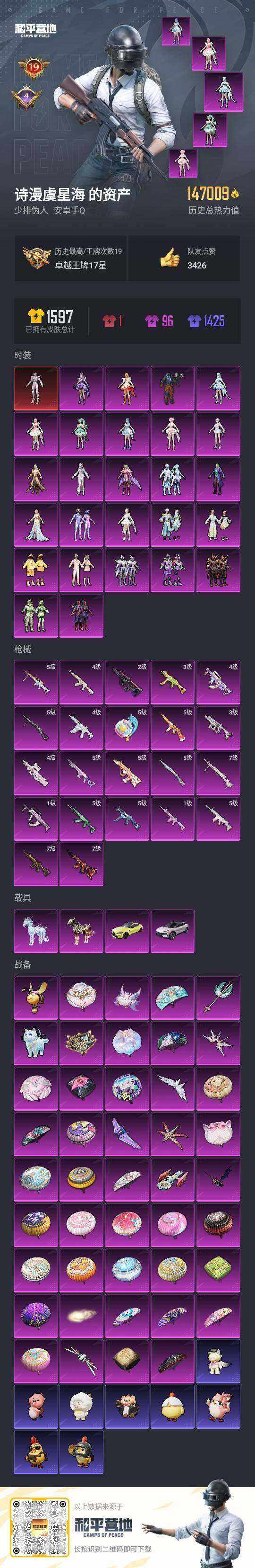 [15579448]安卓 手Q-1神装-26粉装-22特效枪-4载具-12粉色飞行器-14.7w热力值-19王牌印记-302套装-432枪皮【红色神装等级】:最终圣卫者-帕修斯(一级)【红色角色神装】:最终圣卫者-帕修斯【热门品类】:粉装-怪诞乔克,粉装-梦幻火箭,套装-浪漫天命,套装-冥河战士,套装-深海小丑鱼,套装-小丑鱼,套装-奇异狩猎者,角色-军刀雅典娜,套装-龟仙人,套装-暗影哥特,套装-浪漫波比,角色-8号机,角色-Mark.06【粉色套装】:粉装-怪诞乔克,粉装-梦幻火箭,粉装-星之彼岸,粉装-碧影闪光,粉装-闪耀律动,粉装-赤焰黑爵,粉装-紫电风暴,粉装-第五大道,粉装-莲影清波,粉装-憨憨奶龙,角色-严莉莉,角色-小蓝,角色-美雪,角色-美琪,粉装-金丰海韵,角色-千金淑猫,角色-智耀战神,角色-仙女座 瞬,粉装-幻彩电音,角色-狂魇小丑,角色-冷漠罗丽,角色-罗征,角色-荧海星豚,角色-奇迹舞步 贝贝,角色-奇迹舞步 美琪,角色-奇迹舞步 美雪【粉色枪皮等级】:AKM-白勺歌姬(四级),SCAR-L-锦绣绵绵(五级),M416-五爪金龙(七级),M416-风花雪月(七级),M416-电玩时刻(一级),GROZA-巴啦啦小魔仙(四级),GROZA-镜光银凌(一级),AUG-星之彼岸(二级),AUG-暖羊咩咩(五级),M762-青锋波束(五级),蜜獾-荧海星豚(四级),UMP45-恐龙拽拽(三级),UMP45-量子极限(五级),Vector-最终圣卫者(三级),汤姆逊-热量炸弹(五级),P90-冷漠罗丽(四级),Kar98K-巳巳如意(五级),Mk14-甜梦熊击(五级),DP-28-千金淑猫(七级),DP-28-豹影疾电(五级),MG-36-沧焰双生(五级),破片手榴弹-美味星星糖(五级)【粉色载具】:路特斯ELETRE(花绽灰),宝马M4(圣保罗黄),黑曜夜骑,冰绡玉鳞【粉色枪皮】:AKM-白勺歌姬,SCAR-L-锦绣绵绵,M416-五爪金龙,M416-风花雪月,M416-电玩时刻,GROZA-巴啦啦小魔仙,GROZA-镜光银凌,AUG-星之彼岸,AUG-暖羊咩咩,M762-青锋波束,蜜獾-荧海星豚,UMP45-恐龙拽拽,UMP45-量子极限,Vector-最终圣卫者,汤姆逊-热量炸弹,P90-冷漠罗丽,Kar98K-巳巳如意,Mk14-甜梦熊击,DP-28-千金淑