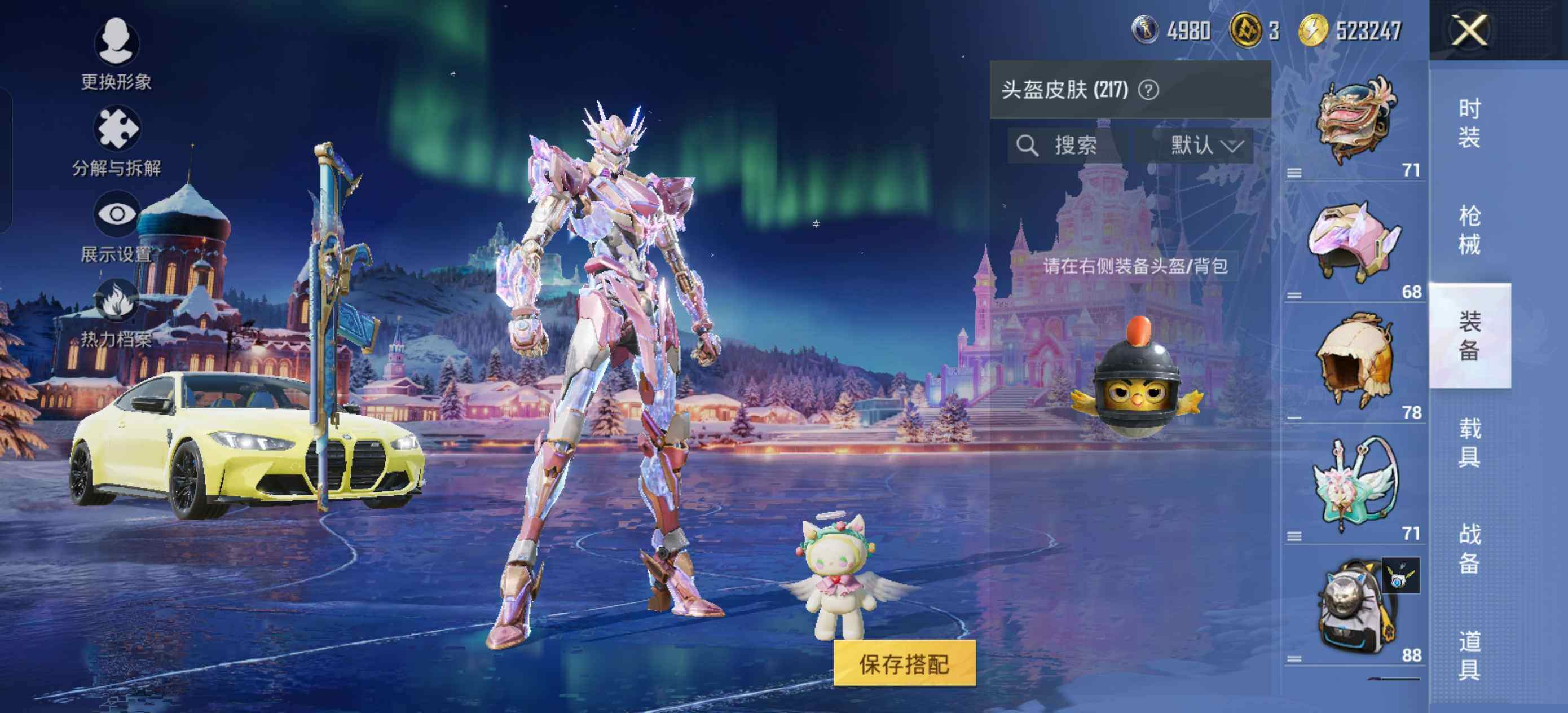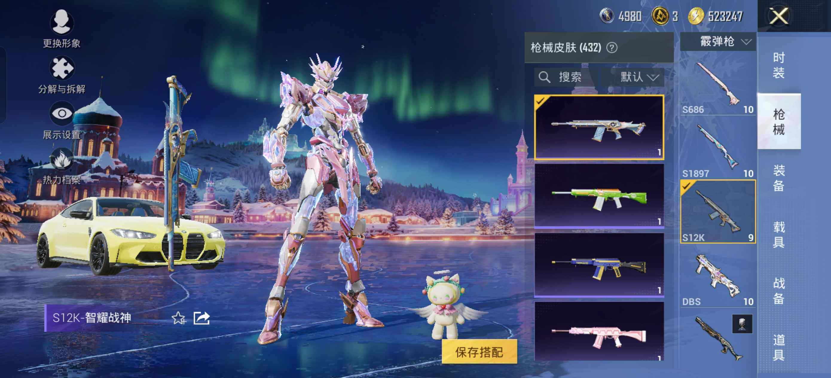 AKM-白勺歌姬,SCAR-L-锦绣绵绵,M416-五爪金龙,M416-风花雪月,M416-电玩时刻,GROZA-巴啦啦小魔仙,GROZA-镜光银凌,AUG-星之彼岸,AUG-暖羊咩咩,M762-青锋波束,UMP45-恐龙拽拽,UMP45-量子极限,Kar98K-巳巳如意,DP-28-千金淑猫