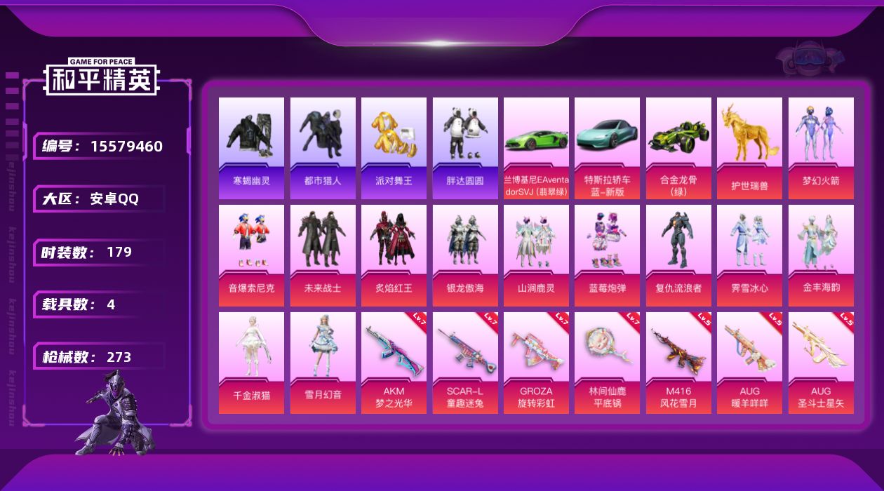 - [13979605]【店主推荐捡漏号!可直接换绑】安卓 手Q-6粉装-4特效枪-2载具-6粉色飞行器-79988热力值-12王牌印记-170套装-232枪皮【热门品类】:粉装-梦幻火箭,套装-奇异狩猎者,套装-龟仙人【粉色载具】:兰博基尼Aventador SVJ(翡翠绿),兰博基尼Estoque(炫光金)【粉色套装】:粉装-梦幻火箭,粉装-飓风飞鹰,粉装-蓝莓炮弹,粉装-恐龙拽拽,角色-圣堂之誓,粉装-幻彩电音【粉色枪皮等级】:M416-风花雪月(七级),Kar98K-巳巳如意(五级),M24-暗星紫秘(七级),DP-28-豹影疾电(五级)【粉色枪皮】:M416-风花雪月,Kar98K-巳巳如意,M24-暗星紫秘,DP-28-豹影疾电【粉色飞行器】:梦幻火箭飞行器,神秘黑猫飞行器,齐天大圣飞行器,青春物语飞行器,繁龙极客飞行器