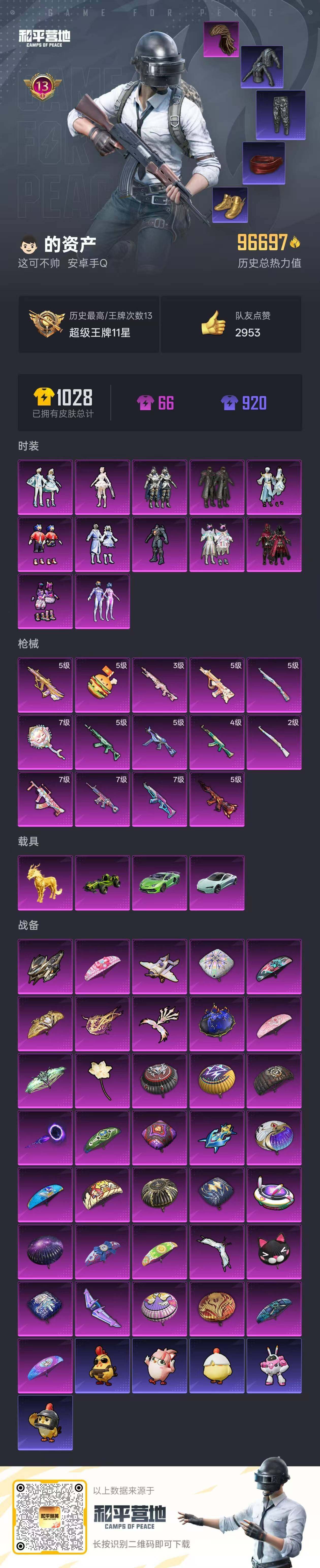 - PX_2087803- 可二次 安卓手Q-8王牌印记-4粉装-8特效枪-0载具-40513热力值-74套装-140枪皮-0卓越印记-0传奇印记 【4粉装】,酣梦娃娃,天星战神,未来歌姬,瑰丽时代 【8特效枪】,AKM-绿萝繁花-5级 SCAR-L-锦绣绵绵-5级 M416-电玩时刻-5级 GROZA-镜光银凌-5级 M762-青锋波束-5级 Kar98K-巳巳如意-5级 Kar98K-未来歌姬-7
