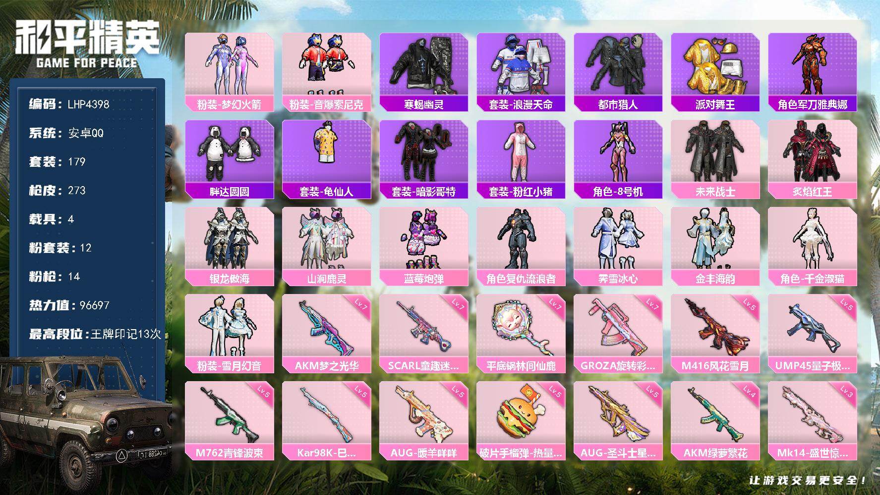 [15579460]【特价出售/店主推荐】 安卓 手Q-12粉装-14特效枪-4载具-10粉色飞行器-9.6w热力值-13王牌印记-179套装-273枪皮【热门品类】:粉装-梦幻火箭,粉装-音爆索尼克,套装-寒蝎幽灵,套装-浪漫天命,套装-都市猎人,套装-派对舞王,角色-军刀雅典娜,套装-胖达圆圆,套装-龟仙人,套装-暗影哥特,套装-粉红小猪,角色-8号机【粉色套装】:粉装-未来战士,粉装-梦幻火箭,粉装-炙焰红王,粉装-银龙傲海,粉装-山涧鹿灵,粉装-蓝莓炮弹,角色-复仇流浪者,粉装-霁雪冰心,粉装-音爆索尼克,粉装-金丰海韵,角色-千金淑猫,粉装-雪月幻音粉色枪皮等级】:AKM-梦之光华(七级),AKM-绿萝繁花(四级),SCAR-L-童趣迷兔(七级),M416-风花雪月(五级),GROZA-旋转彩虹(七级),AUG-暖羊咩咩(五级),AUG-圣斗士星矢(五级),M762-青锋波束(五级),UMP45-量子极限(五级),Kar98K-未来歌姬(二级),Kar98K-巳巳如意(五级),Mk14-盛世惊鸿(三级),平底锅-林间仙鹿(七级),破片手榴弹-热量炸弹(五级)【粉色载具】:特斯拉Roadster(水滴蓝),兰博基尼Aventador SVJ(翡翠绿),合金龙骨(绿),护世瑞兽【粉色枪皮】:AKM-梦之光华,AKM-绿萝繁花,SCAR-L-童趣迷兔,M416-风花雪月,GROZA-旋转彩虹,AUG-暖羊咩咩,AUG-圣斗士星矢,M762-青锋波束,UMP45-量子极限,Kar98K-未来歌姬,Kar98K-巳巳如意,Mk14-盛世惊鸿,平底锅-林间仙鹿,破片手榴弹-热量炸弹【粉色飞行器】:梦幻火箭飞行器,天之羽翼飞行器,太空嘟嘟飞行器,冠军兔兔飞行器,深渊漩涡飞行器,曦光华影飞行器,凤舞九天飞行器,万象金身飞行器,月下星之子飞行器,墨金战记飞行器