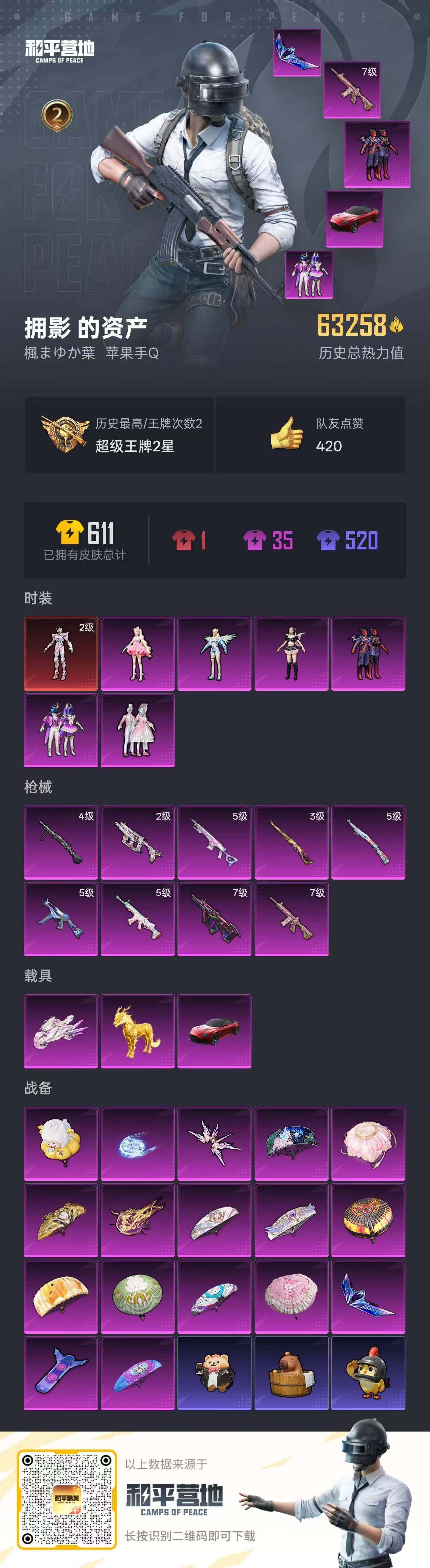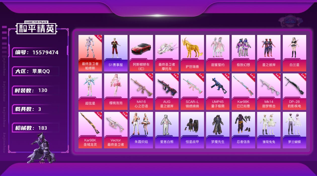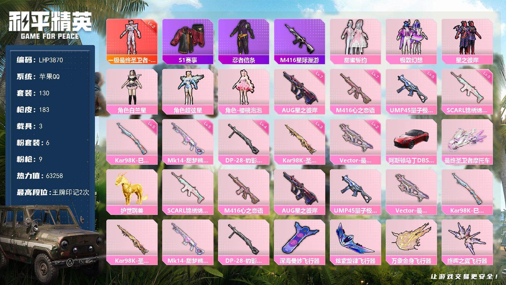 [15579474]【特价出售/店主推荐】 苹果 手Q-1神装-6粉装-9特效枪-3载具-5粉色飞行器-6.3w热力值-2王牌印记-130套装-183枪皮【红色神装等级】:最终圣卫者-帕修斯(二级)【红色角色神装】:最终圣卫者-帕修斯【热门品类】:套装-S1赛事,套装-忍者信条,M416-星际漫游【粉色套装】:粉装-甜蜜誓约,粉装-极致幻想,粉装-星之彼岸,角色-白兰星,角色-超弦星,角色-樱桃泡泡【粉色枪皮等级】:SCAR-L-锦绣绵绵(五级),M416-心之恋语(七级),AUG-星之彼岸(七级),UMP45-量子极限(五级),Vector-最终圣卫者(二级),Kar98K-巳巳如意(五级),Kar98K-圣域龙灵(三级),Mk14-甜梦熊击(五级),DP-28-豹影疾电(四级)【粉色载具】:阿斯顿马丁DBS(红),最终圣卫者摩托车,护世瑞兽【粉色枪皮】:SCAR-L-锦绣绵绵,M416-心之恋语,AUG-星之彼岸,UMP45-量子极限,Vector-最终圣卫者,Kar98K-巳巳如意,Kar98K-圣域龙灵,Mk14-甜梦熊击,DP-28-豹影疾电【粉色飞行器】:深海曼妙飞行器,炫紫旋律飞行器,万象金身飞行器,终晖之翼飞行器,宁雨蝶飞行器