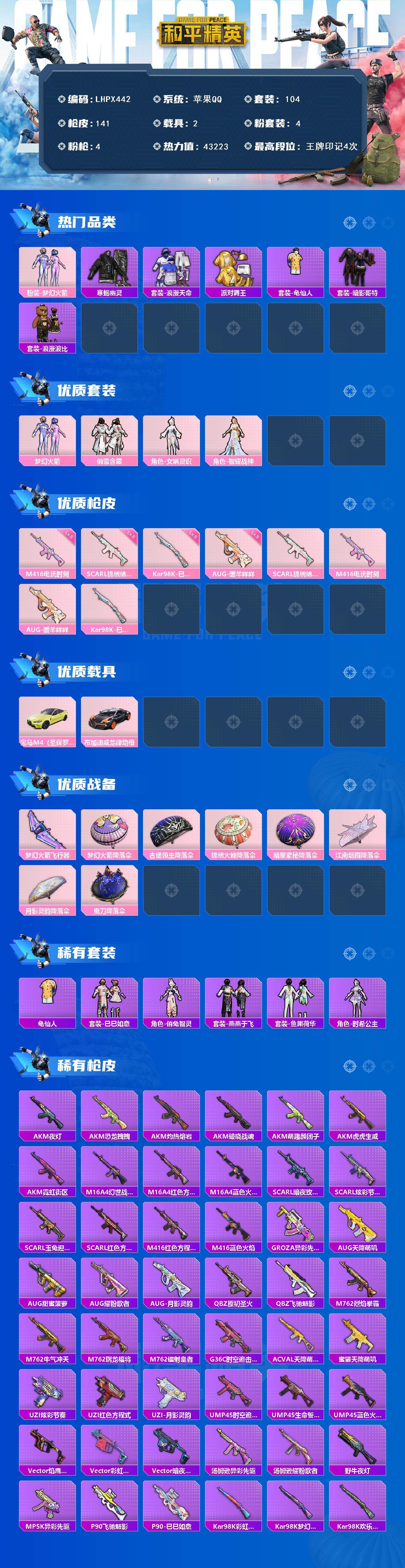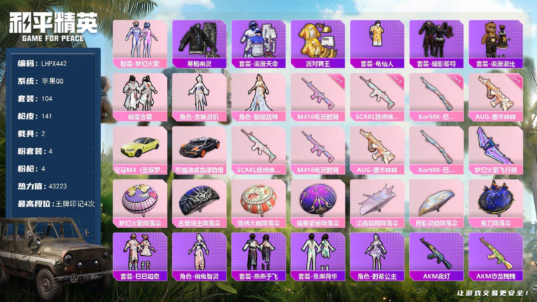[15579521]【店主推荐捡漏号!可直接换绑】苹果 手Q-4粉装-4特效枪-2载具-1粉色飞行器-43223热力值-4王牌印记-104套装-141枪皮 【热门品类】:粉装-梦幻火箭,套装-寒蝎幽灵,套装-浪漫天命,套装-派对舞王,套装-龟仙人,套装-暗影哥特,套装-浪漫波比 【粉色套装】:粉装-梦幻火箭,粉装-俏雪含霜,角色-女娲灵识,角色-智耀战神 【粉色枪皮等级】:SCAR-L-锦绣绵绵(五级),M416-电玩时刻(五级),AUG-暖羊咩咩(五级),Kar98K-巳巳如意(五级) 【粉色载具】:宝马M4(圣保罗黄),布加迪威龙(律动橙) 【粉色枪皮】:SCAR-L-锦绣绵绵,M416-电玩时刻,AUG-暖羊咩咩,Kar98K-巳巳如意 【粉色飞行器】:梦幻火箭飞行器 【粉色降落伞】:梦幻火箭降落伞,古堡领主降落伞,锦绣火鲤降落伞,暗星紫秘降落伞,江南烟雨降落伞,月影灵韵降落伞,鬼刀降落伞 【稀有套装】:套装-龟仙人,套装-巳巳如意,角色-俏兔智灵,套装-燕燕于飞,套装-鱼渊荷华,角色-时希公主 【稀有枪皮】:AKM-夜灯,AKM-恐龙拽拽,AKM-灼热熔岩,AKM-破晓战魂,AKM-萌趣颜团子,AKM-虎虎生威,AKM-霓虹街区,M16A4-幻世战舞者,M16A4-红色方程式,M16A4-蓝色火焰,SCAR-L-暗夜玫瑰,SCAR-L-炫彩节奏,SCAR-L-玉兔迎春,SCAR-L-红色方程式,M416-红色方程式,M416-蓝色火焰,GROZA-异彩先驱,AUG-天降萌叽,AUG-甜蜜菠萝,AUG-耀粉歌者,AUG-月影灵韵,QBZ-原初圣火,QBZ-飞驰魅影,M762-烈焰拳霸,M762-牛气冲天,M762-瑞龙福将,M762-镭射皇者,G36C-时空追击者,AC-VAL-天降萌叽,蜜獾-天降萌叽,UZI-炫彩节奏,UZI-红色方程式,UZI-月影灵韵,UMP45-时空追击者,UMP45-生命誓言,UMP45-蓝色火焰,Vector-焰鹰斗篷,Vector-彩虹符号,Vector-暗夜玫瑰,汤姆逊-异彩先驱,汤姆逊-耀粉歌者,野牛-夜灯,MP5K-异彩先驱,P90-飞驰魅影,P90-巳巳如意,Kar98K-彩虹符号,Kar98K-梦幻火箭,Kar98K-欢乐麻酱,Kar98K-电玩视界,Kar98K-红色方程式,Kar98K-飞驰魅影,M24-炫彩节奏,AWM-焰鹰斗篷,