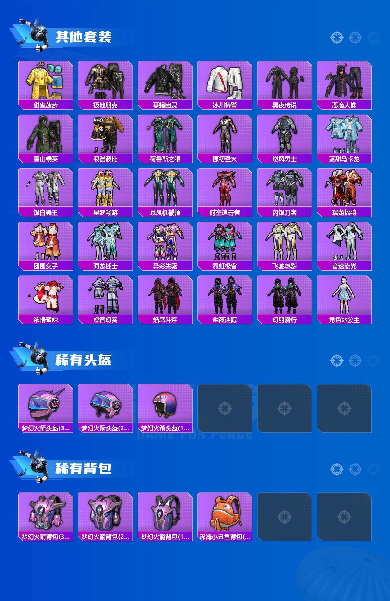 - [12233237]9粉装 8特效枪 2载具 12印记 可二次 可修改实名 身法装备:都市猎人,暗影哥特(红眼罩),Mark.06(新蓝螳螂) 优质装备:合金龙骨(蓝),甜心巧克力,都市猎人,M416心之恋语,梦幻火箭(新101)(新火箭少女101粉色套装),宝贝奶油派,天使彩虹糖,智能音符,星之彼岸,DP-28暗夜鎏金,SCAR-L纯梦嫁纱,Kar98K未来歌姬,七级SCAR-L-纯梦嫁纱,七级DP-28-暗夜鎏金,七级M416-心之恋语,UMP45量子极限,千金淑猫,GROZA-镜光银凌,Kar98K-巳巳如意 热门装扮:蔷薇星,闲梦青缨,动感兔斯基,鹰眼刺客,呆萌铁蟹,都市猎人 载具:冰绡玉鳞 稀有枪皮:DP-28-豹影疾电 五级特效枪:五级UMP45-量子极限,五级GROZA-镜光银凌,五级Kar98K-巳巳如意,五级DP-28-豹影疾电 四级特效枪:四级Kar98K-未来歌姬 紫色装扮:幻彩翩翩,SS23特训,妙红点点,霓虹热舞,SS30特训套装,SS31特训套装,云朵鹅,彩虹兔,雪绒豹,SS33特训套装,青涩时光,旭日情侣,田园牧歌,轻风白浪,和煦暖阳,SS22特训,顶瓜瓜,坚韧舞者,冰爽海盐,浓情蜜辣,风暴特警,飞行日记,魅力单车,鹤鸣,黑色伏地魔,龙的传人,龟仙人,冰河战士,龙魂突击队,蝶变,香桃花海,霓虹街区,超能勇士,都市漫游者,长空猛禽,极光猎影,蓝海鲸歌,街头潮人,涂山之恋,清新柠檬,灰色格斗者,海岛探路者,柠萌假日,血色贵族,糯粉咩咩,缤纷果语,荣耀,蓝彩潮人,蓝色运动,甜蜜告白,空岛之星,白熊同盟,萝兰蝴蝶,SS29特训,达芬奇,星途旅人,雏菊兔兔,热情海星,SS28特训,创世·追猎,Mark.06(新蓝螳螂),鱼渊荷华,燕燕于飞,巳巳如意,森林游猎者,风玲,智谋强哥,小狗蛇点点,异域银装,青团波波,糖糖葫芦,棉花软糖,竞技名士,都市丽猫,街头风暴,暗影哥特(红眼罩),红熊茄茄,纯真浪花,深海梦境,惊鸿侠骨,神气柴柴,懵萌河马,SS24特训(SS24特训套装),SS25特训,绝对偶像,锦衣飞扬,冰公主,SS27特训,焰鹰斗篷,幻羽潜行,无暇誓言,浪漫天命,小丑鱼,星河浪客,SS26特训,春光漫游,快闪甜心,贝斯之夜,小鸟芋圆,大橘大利,SS32特训服(SS32特训套装),春日漫步,糯粉咪咪(套装-糯粉咩咩),蓝冰羽,绯格组合,萌黄之夏,紫幽梦,粉恋花,白糯