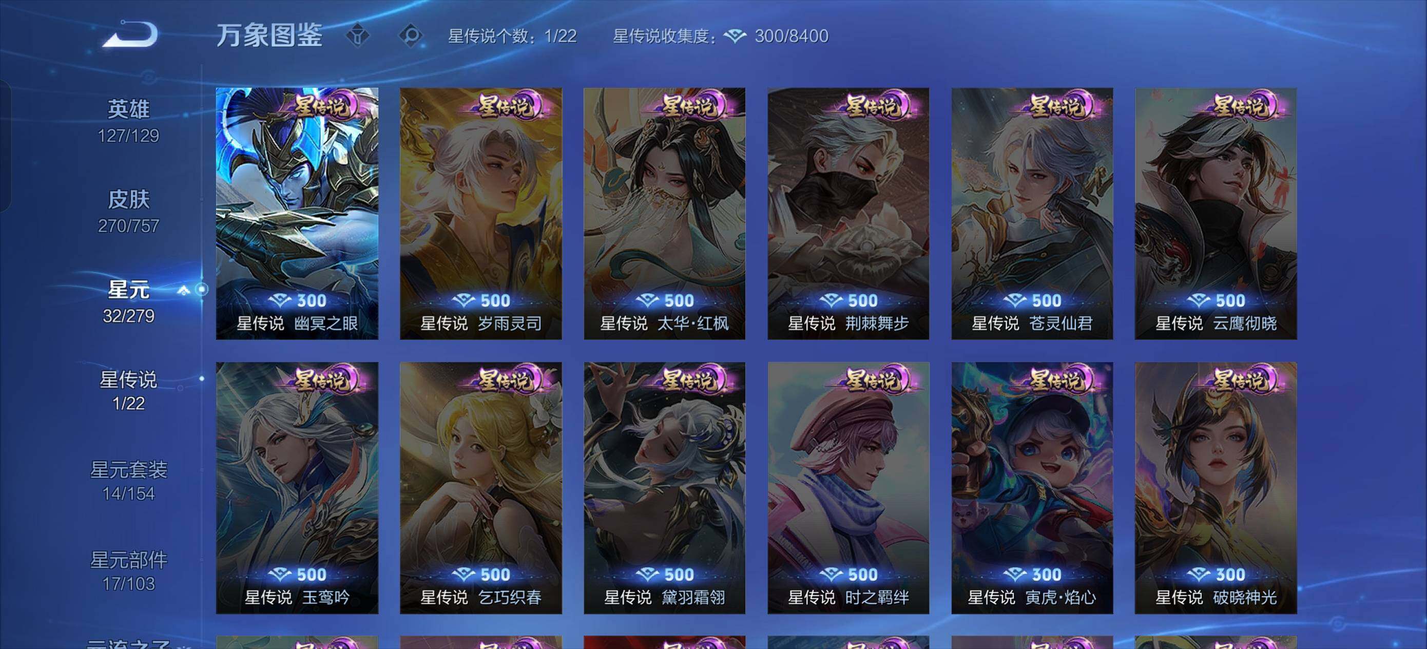 虞姬凯尔特女王,白起狰,太乙真人饕餮,曹操烛龙,芈月重明,典韦穷奇,狂铁御狮,米莱狄御霄,牛魔御旌,盾山御銮,夏侯惇朔风刀,明世隐疑决卦,老夫子醍醐杖,鬼谷子原初探秘者,狄仁杰万华元夜,程咬金演武夺筹,钟馗驱傩正仪,吕布猎兽之王,嬴政白昼王子,女娲朔望之晖,典韦蓝屏警告,钟馗神迹守卫,鲁班七号狮舞东方,沈梦溪星空之诺,李元芳银河之约,刘邦夺宝奇兵,马可波罗暗影游猎,弈星混沌棋,达摩沙漠行僧,兰陵王金庭之子,沈梦溪大漠名商,李元芳云中旅人,桑启海盐诗旅,裴擒虎擒涛扼浪,鲁班大师探海日志,张良古海寻踪