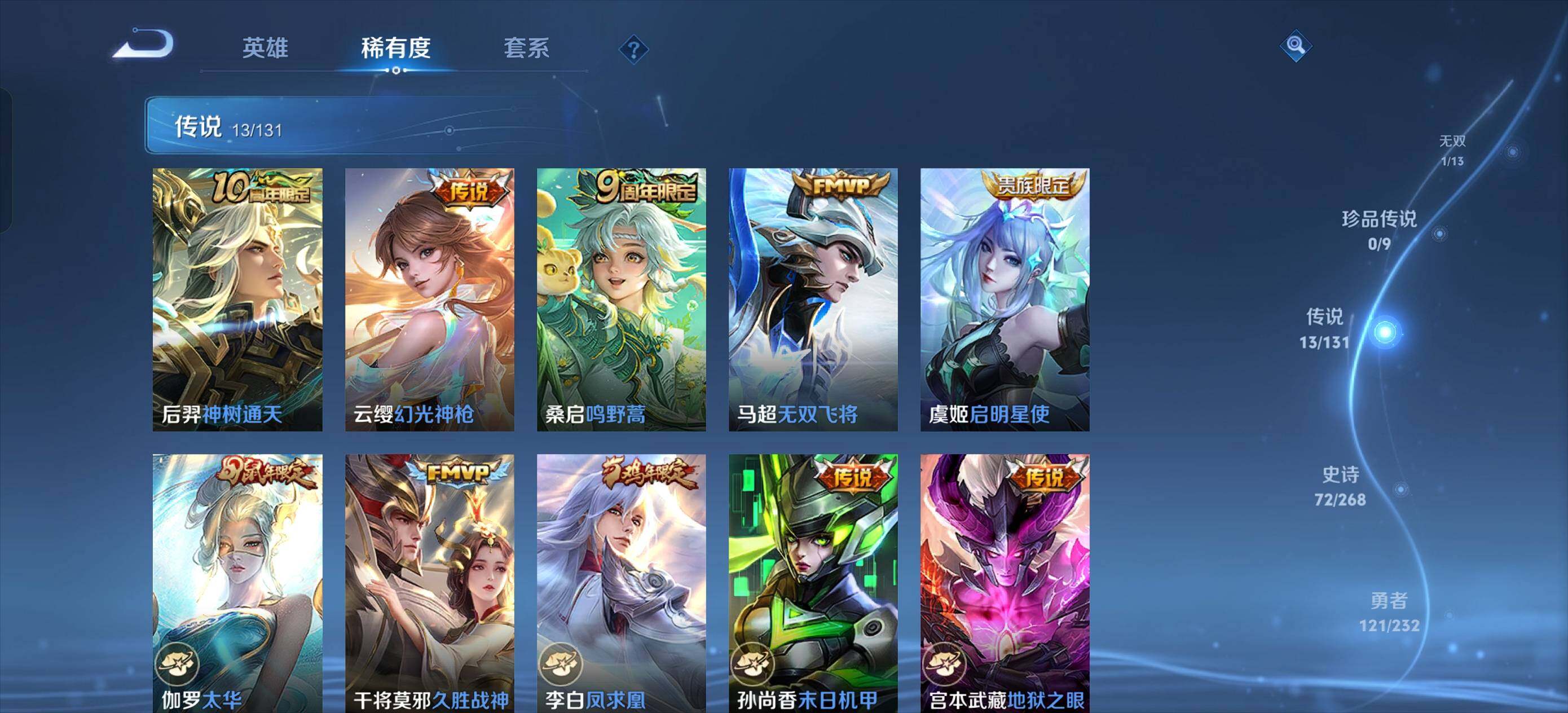 【传说皮肤】:后羿神树通天,云缨幻光神枪,桑启鸣野蒿,马超无双飞将,虞姬启明星使,伽罗太华,干将莫邪久胜战神,李白凤求凰,孙尚香末日机甲,宫本武藏地狱之眼,孙悟空地狱火,武则天海洋之心,狄仁杰超时空战士