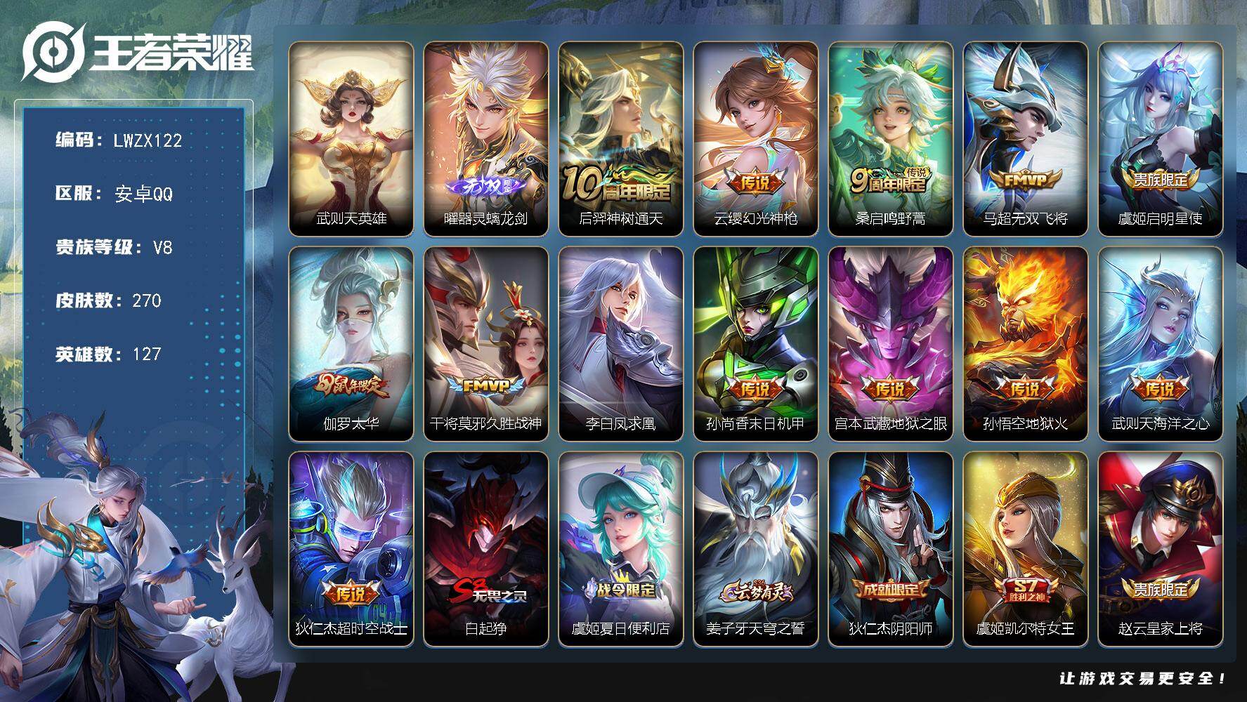 [15579568]安卓Q-V8-最强王者段位-127英雄-270皮肤-1典藏英雄-1无双-13传说-72史诗