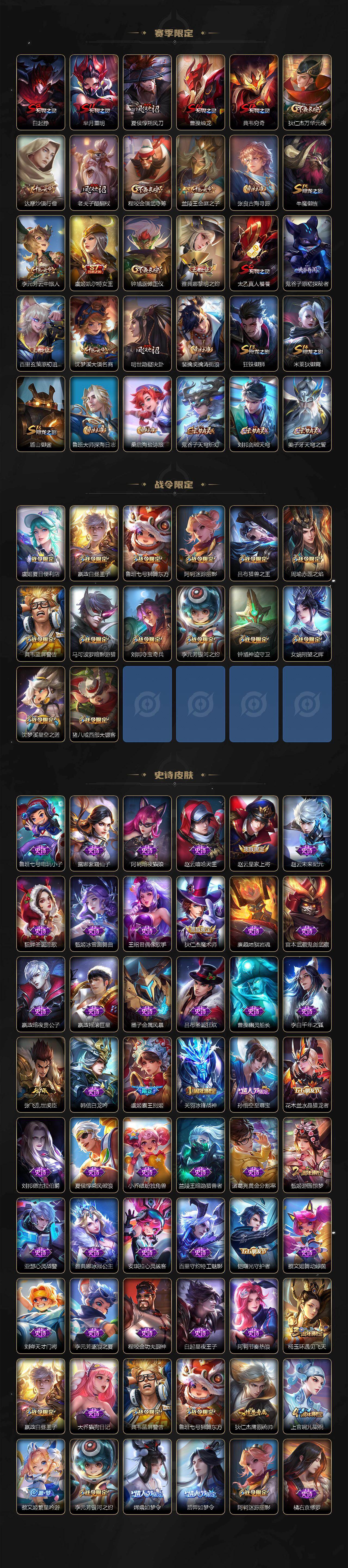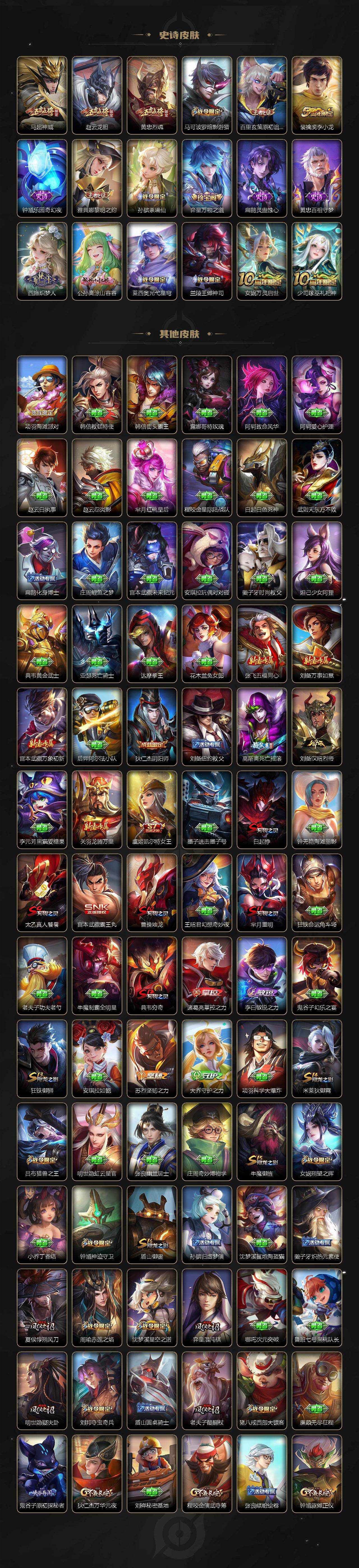【限定皮肤】:白起狰,虞姬夏日便利店,姜子牙天穹之誓,狄仁杰阴阳师,虞姬凯尔特女王,赵云皇家上将,赵云龙胆,嬴政白昼王子,鲁班七号狮舞东方,高渐离死亡摇滚,阿轲迷踪丽影,芈月重明,吕布猎兽之王,周瑜赤莲之焰,夏侯惇朔风刀,甄姬游园惊梦,曹操烛龙,典韦穷奇,典韦蓝屏警告,马可波罗暗影游猎,狄仁杰魔术师,狄仁杰万华元夜,达摩沙漠行僧,项羽海滩派对,老夫子醍醐杖,关羽冰锋战神,程咬金演武夺筹,刘邦夺宝奇兵,兰陵王金庭之子,孙悟空至尊宝,牛魔御旌,后羿如梦令,李元芳银河之约,李元芳云中旅人,虞姬霸王别姬,虞姬启明星使,钟馗神迹守卫,钟馗驱傩正仪,杨玉环遇见飞天,女娲朔望之晖,雅典娜黎明之约,蔡文姬繁星吟游,太乙真人饕餮,鬼谷子原初探秘者,黄忠烈魂,百里玄策原初追逐者,弈星混沌棋,沈梦溪星空之诺,沈梦溪大漠名商,明世隐疑决卦,裴擒虎李小龙,裴擒虎擒涛扼浪,狂铁御狮,米莱狄御霄,伽罗太华,盾山御銮,猪八戒西部大镖客,上官婉儿梁祝,嫦娥如梦令,鲁班大师探海日志,桑启海盐诗旅,张良古海寻踪,鬼谷子天穹祈灯,沈梦溪龙舞盛年,刘邦剑破天穹