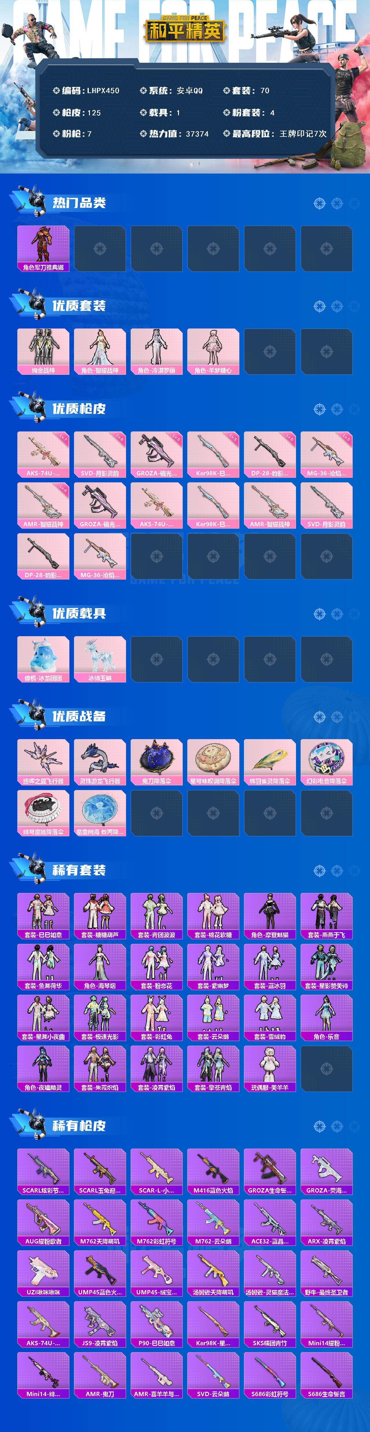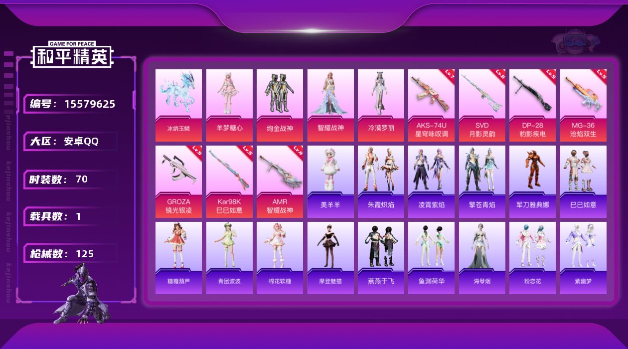 [15579625]【店主推荐捡漏号!可直接换绑】安卓 手Q-4粉装-7特效枪-1载具-2粉色飞行器-37374热力值-7王牌印记-70套装-125枪皮 【热门品类】:角色-军刀雅典娜 【粉色套装】:粉装-绚金战神,角色-智耀战神,角色-冷漠罗丽,角色-羊梦糖心 【粉色枪皮等级】:GROZA-镜光银凌(五级),AKS-74U-星穹咏叹调(七级),Kar98K-巳巳如意(五级),AMR-智耀战神(四级),SVD-月影灵韵(六级),DP-28-豹影疾电(五级),MG-36-沧焰双生(五级) 【粉色载具】:僚机-冰龙团团,冰绡玉鳞 【粉色枪皮】:GROZA-镜光银凌,AKS-74U-星穹咏叹调,Kar98K-巳巳如意,AMR-智耀战神,SVD-月影灵韵,DP-28-豹影疾电,MG-36-沧焰双生 【粉色飞行器】:终晖之翼飞行器,灵珠游龙飞行器 【粉色降落伞】:鬼刀降落伞,星穹咏叹调降落伞,辉羽雀灵降落伞,幻彩电音降落伞,绯穹魔姬降落伞,魔童闹海 敖丙降落伞,炫彩糖果降落伞 【稀有套装】:套装-巳巳如意,套装-糖糖葫芦,套装-青团波波,套装-棉花软糖,角色-摩登魅猫,套装-燕燕于飞,套装-鱼渊荷华,角色-海琴烟,套装-粉恋花,套装-紫幽梦,套装-蓝冰羽,套装-星影赞美诗,套装-星渊小夜曲,套装-极速光影,套装-彩虹兔,套装-云朵鹅,套装-雪绒豹,角色-乐音,角色-夜瞳黯灵,套装-朱霞炽焰,套装-凌霄紫焰,套装-擎苍青焰,玩偶服-美羊羊 【稀有枪皮】:SCAR-L-炫彩节奏,SCAR-L-玉兔迎春,SCAR-L-小狗蛇点点,M416-蓝色火焰,GROZA-生命誓言,GROZA-荧海星豚,AUG-耀粉歌者,M762-天降萌叽,M762-彩虹符号,M762-云朵鹅,ACE32-蓝晶绮麟,ARX-凌霄紫焰,UZI-啾咪啾咪,UMP45-蓝色火焰,UMP45-绒宝小鹅,汤姆逊-天降萌叽,汤姆逊-灵猫魔法师,野牛-最终圣卫者,AKS-74U-鬼刀,JS9-凌霄紫焰,P90-巳巳如意,Kar98K-星穹咏叹调,SKS-糯团青竹,Mini14-耀粉歌者,Mini14-绯穹魔姬,AMR-喜羊羊与灰太狼,AMR-鬼刀,SVD-云朵鹅,S686-彩虹符号,S686-生命誓言,S686-巳巳如意,S12K-玩趣呆呆,S12K-破晓战魂,DBS-彩虹符号,DBS-荧海星豚,DBS-幻彩电音,SPAS-12-云朵鹅,M