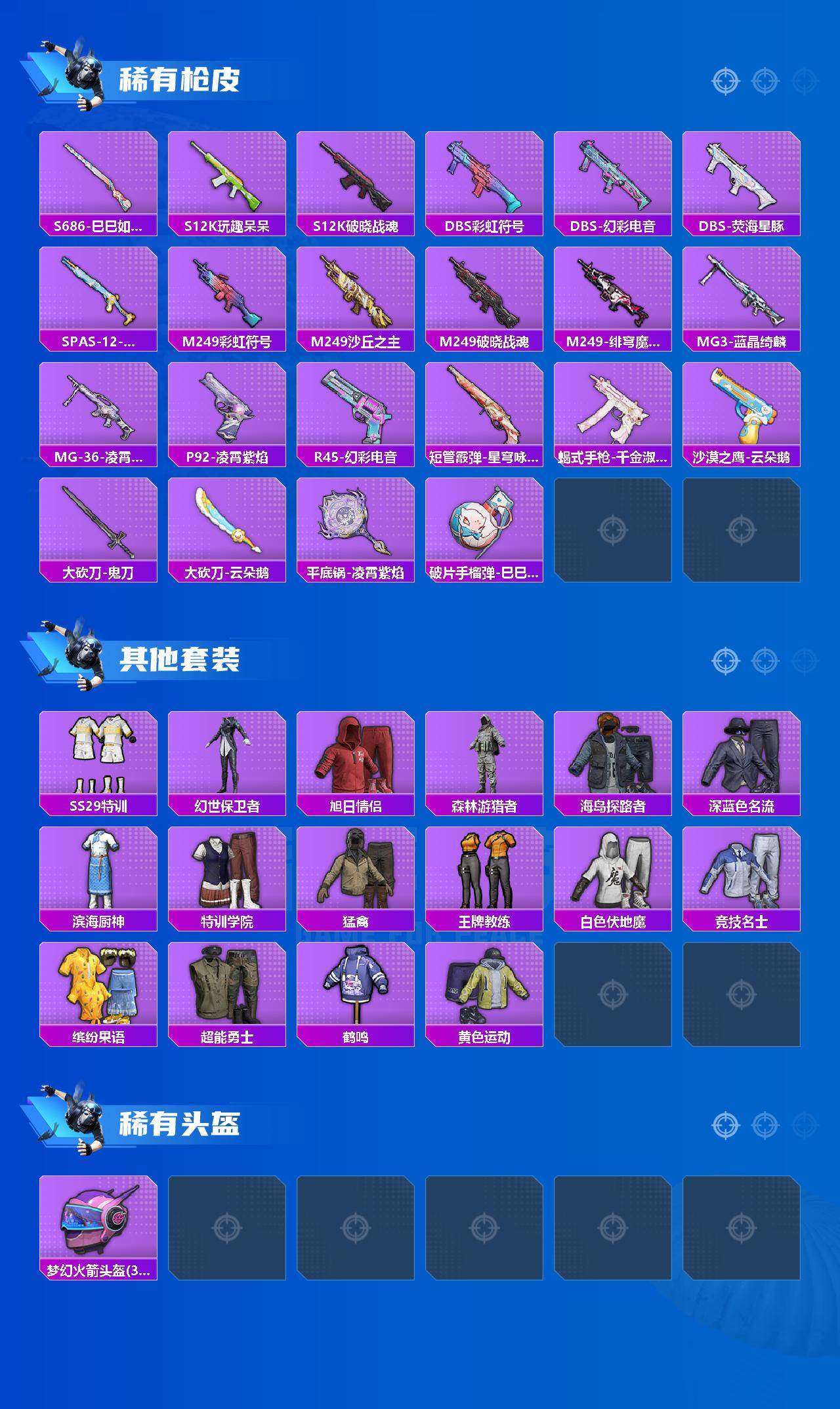 【稀有枪皮】:SCAR-L-炫彩节奏,SCAR-L-玉兔迎春,SCAR-L-小狗蛇点点,M416-蓝色火焰,GROZA-生命誓言,GROZA-荧海星豚,AUG-耀粉歌者,M762-天降萌叽,M762-彩虹符号,M762-云朵鹅,ACE32-蓝晶绮麟,ARX-凌霄紫焰,UZI-啾咪啾咪,UMP45-蓝色火焰,UMP45-绒宝小鹅,汤姆逊-天降萌叽,汤姆逊-灵猫魔法师,野牛-最终圣卫者,AKS-74U-鬼刀,JS9-凌霄紫焰,P90-巳巳如意,Kar98K-星穹咏叹调,SKS-糯团青竹,Mini14-耀粉歌者,Mini14-绯穹魔姬,AMR-喜羊羊与灰太狼,AMR-鬼刀,SVD-云朵鹅,S686-彩虹符号,S686-生命誓言,S686-巳巳如意,S12K-玩趣呆呆,S12K-破晓战魂,DBS-彩虹符号,DBS-荧海星豚,DBS-幻彩电音,SPAS-12-云朵鹅,M