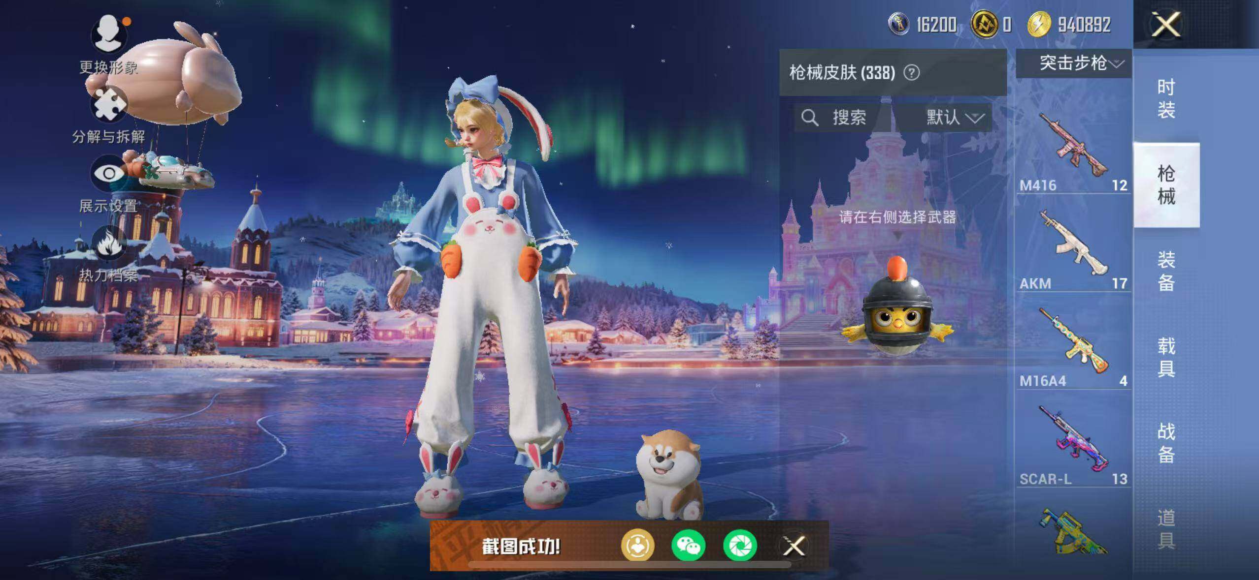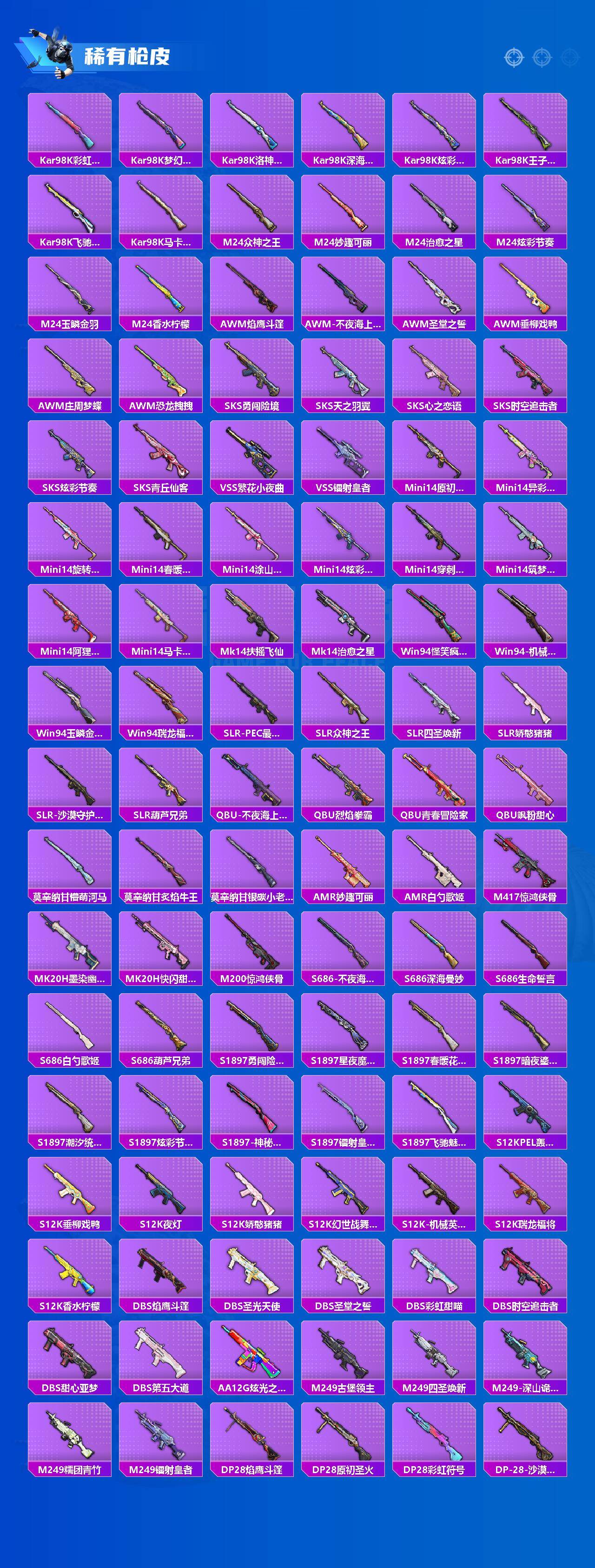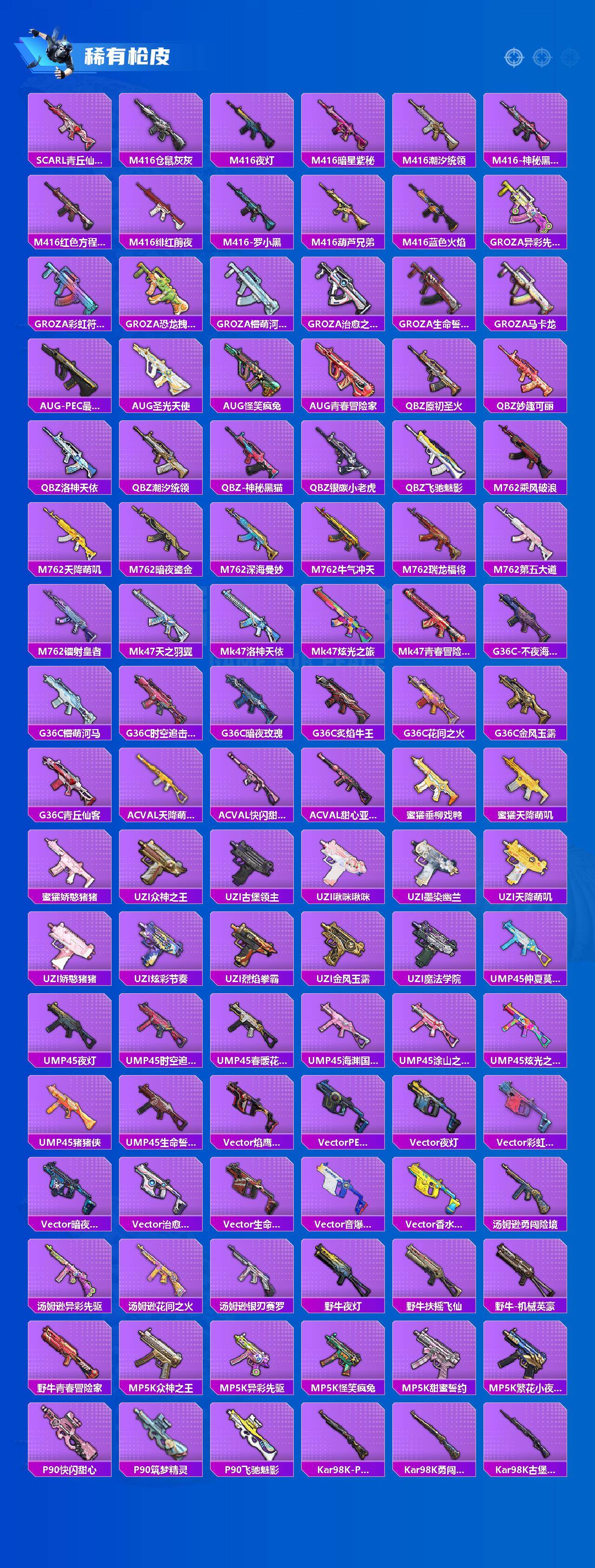 M416-仓鼠灰灰,AUG-PEC最牛战神,M762-瑞龙福将,Kar98K-古堡领主,Kar98K-深海曼妙,M24-香水柠檬,M249-古堡领主
