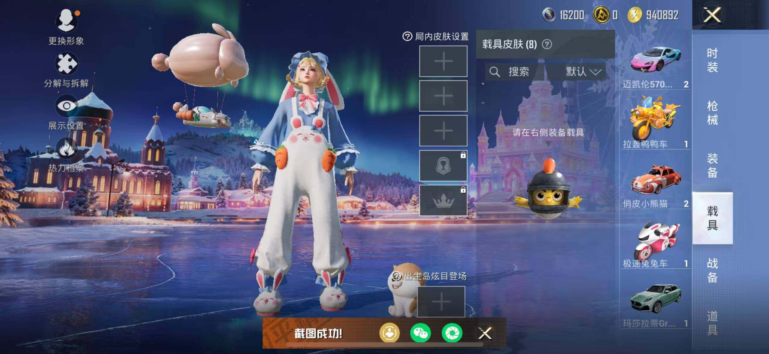 特斯拉Model_3(冷光银),玛莎拉蒂Grecale(薄荷绿),迈凯伦570S(炫冰蓝),迈凯伦570S(天际蓝),合金龙骨(绿),俏皮小熊猫,极速兔兔车,拉轰鸭鸭车,僚机-萌兔起飞