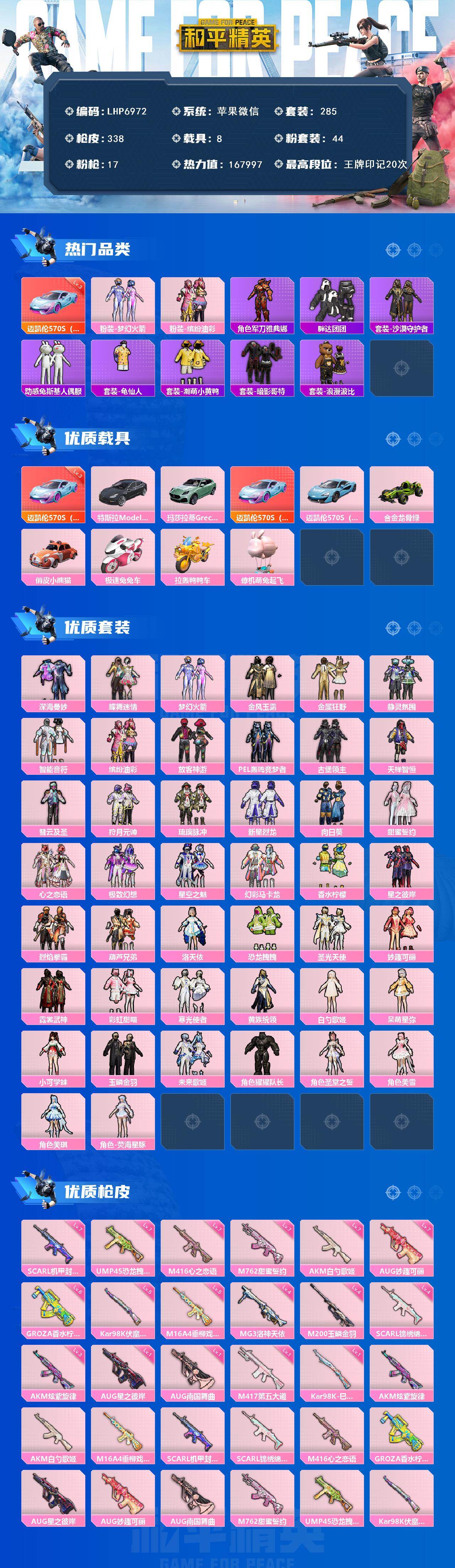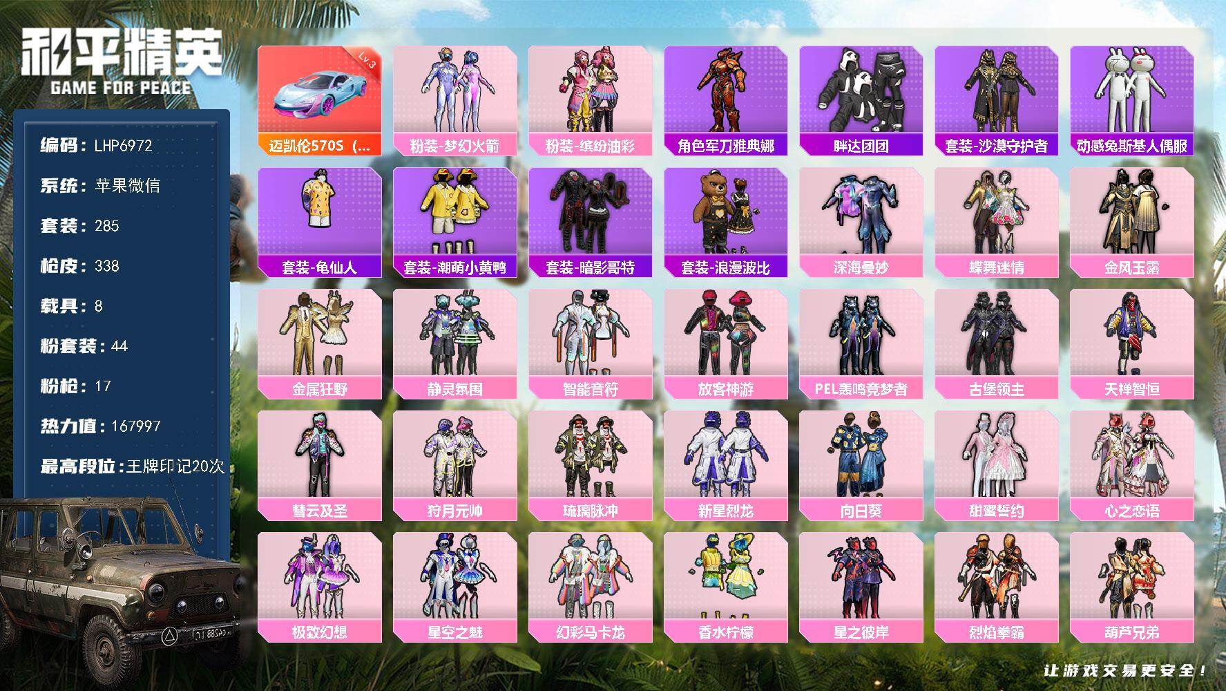 [15579622]【特价出售/店主推荐】苹果 微信-44粉装-17特效枪-8载具-20粉色飞行器-167997热力值-20王牌印记-285套装-338枪皮 【红色载具】:迈凯伦570S(炫冰蓝)(三级) 【热门品类】:粉装-梦幻火箭,粉装-缤纷油彩,角色-军刀雅典娜,套装-胖达团团,套装-沙漠守护者,套装-动感兔斯基人偶服,套装-龟仙人,套装-潮萌小黄鸭,套装-暗影哥特,套装-浪漫波比 【粉色套装】:粉装-深海曼妙,粉装-蝶舞迷情,粉装-梦幻火箭,粉装-金风玉露,粉装-金属狂野,粉装-静灵氛围,粉装-智能音符,粉装-缤纷油彩,粉装-放客神游,粉装-PEL轰鸣竞梦者,粉装-古堡领主,粉装-天禅智恒,粉装-彗云及圣,粉装-狩月元帅,粉装-琉璃脉冲,粉装-新星烈龙,粉装-向日葵,粉装-甜蜜誓约,粉装-心之恋语,粉装-极致幻想,粉装-星空之魅,粉装-幻彩马卡龙,粉装-香水柠檬,粉装-星之彼岸,粉装-烈焰拳霸,粉装-葫芦兄弟,角色-洛天依,粉装-恐龙拽拽,粉装-圣光天使,粉装-妙趣可丽,粉装-霓裳武神,粉装-彩虹甜喵,粉装-寒光使者,粉装-黄族统领,角色-白勺歌姬,角色-呆萌星弥,角色-小可学妹,粉装-玉鳞金羽,粉装-未来歌姬,角色-猩猩队长,角色-圣堂之誓,角色-美雪,角色-美琪,角色-荧海星豚 【粉色枪皮等级】:AKM-炫紫旋律(三级),AKM-白勺歌姬(七级),M16A4-垂柳戏鸭(五级),SCAR-L-机甲封神(七级),SCAR-L-锦绣绵绵(四级),M416-心之恋语(七级),GROZA-香水柠檬(六级),AUG-星之彼岸(一级),AUG-妙趣可丽(七级),AUG-南国舞曲(一级),M762-甜蜜誓约(七级),UMP45-恐龙拽拽(七级),Kar98K-伏魔团(五级),Kar98K-巳巳如意(一级),M417-第五大道(一级),M200-玉鳞金羽(四级),MG3-洛神天依(四级) 【粉色载具】:特斯拉Model 3(冷光银),玛莎拉蒂Grecale(薄荷绿),迈凯伦570S(炫冰蓝),迈凯伦570S(天际蓝),合金龙骨(绿),俏皮小熊猫,极速兔兔车,拉轰鸭鸭车,僚机-萌兔起飞 【粉色枪皮】:AKM-炫紫旋律,AKM-白勺歌姬,M16A4-垂柳戏鸭,SCAR-L-机甲封神,SCAR-L-锦绣绵绵,M416-心之恋语,GROZA-香水柠檬,AUG-星之彼岸,AUG-妙趣可丽,AUG-南