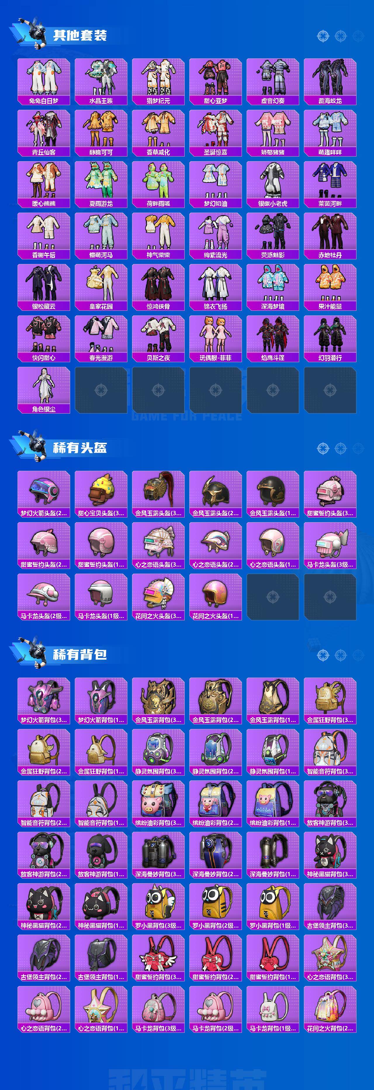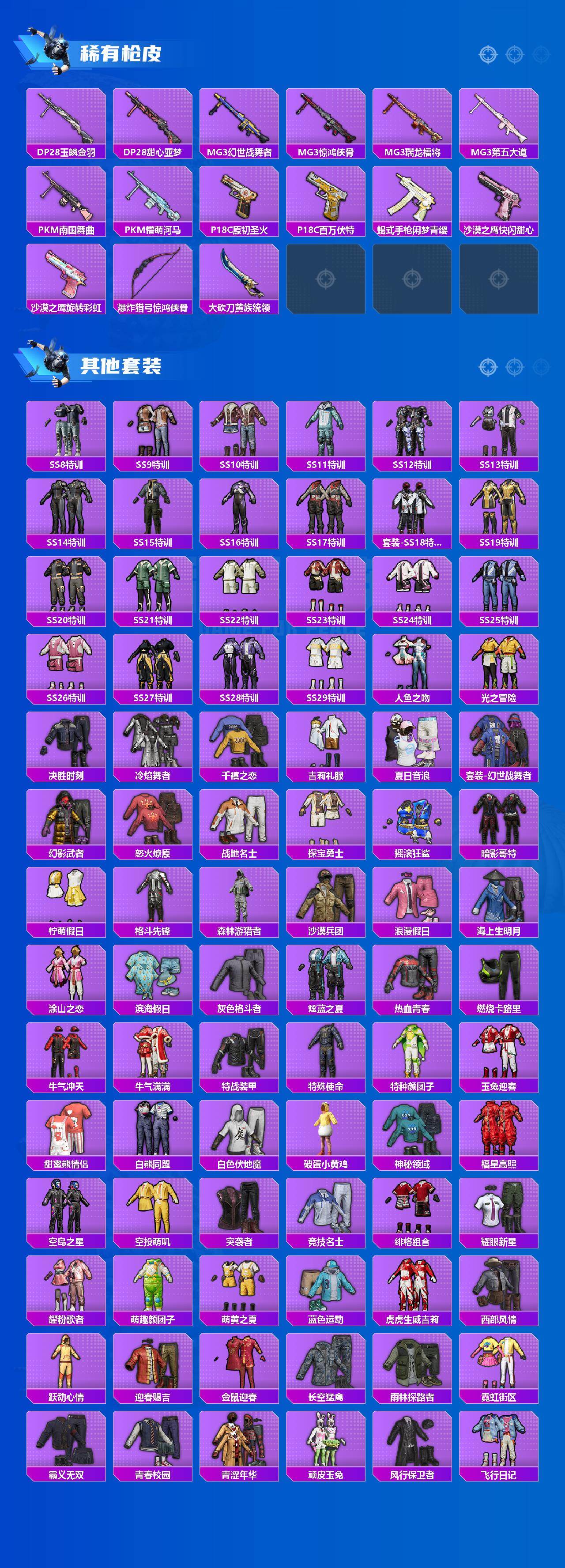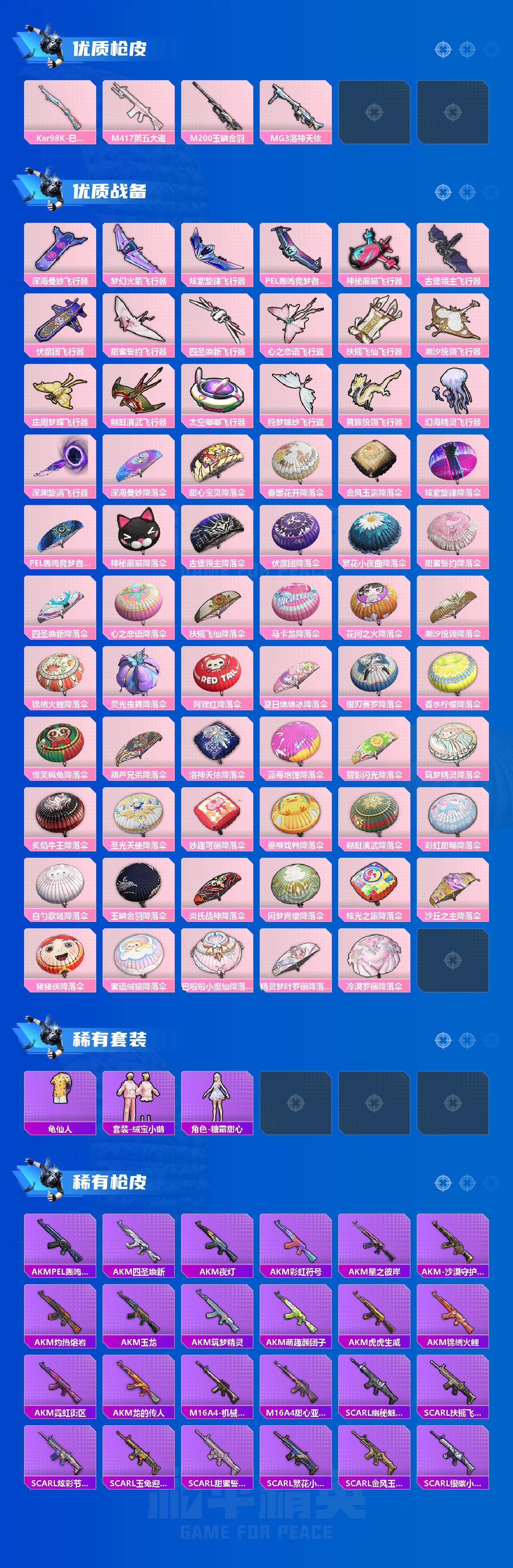 - [12809296]【1196】苹果 手Q-9粉装-9特效枪-1载具-1粉色飞行器-67343热力值-15王牌印记-146套装-209枪皮 【热门品类】:粉装-童趣迷兔,粉装-音爆索尼克,套装-浪漫天命,角色-2B战斗服款,套装-龟仙人,套装-暗影哥特 【粉色载具】:合金龙骨(蓝) 【粉色套装】:粉装-冰霜白皇,粉装-童趣迷兔,粉装-炙焰红王,粉装-音爆索尼克,粉装-第五大道,粉装-飒粉甜心,角色-呆萌星弥,角色-阿尔茜,角色-萨利娅 【粉色枪皮等级】:AKM-炫紫旋律(七级),SCAR-L-童趣迷兔(七级),SCAR-L-青春物语(一级),M416-五爪金龙(四级),M416-至情至圣(九级),M416-电玩时刻(五级),UMP45-相思残雪(七级),Kar98K-巳巳如意(五级),DP-28-豹影疾电(五级) 【粉色枪皮】:AKM-炫紫旋律,SCAR-L-童趣迷兔,SCAR-L-青春物语,M416-五爪金龙,M416-至情至圣,M416-电玩时刻,UMP45-相思残雪,Kar98K-巳巳如意,DP-28-豹影疾电 【粉色飞行器】:星之彼岸飞行器 【粉色降落伞】:未来战士降落伞,春暖花开降落伞,神秘黑猫降落伞,星之彼岸降落伞,蓝莓炮弹降落伞,筑梦精灵降落伞,垂柳戏鸭降落伞,第五大道降落伞,仲夏莫吉托降落伞,江南烟雨降落伞,冷漠罗丽降落伞 【稀有套装】:套装-龟仙人,角色-达芬奇,套装-霓虹热舞,套装-彩虹兔,套装-云朵鹅,套装-雪绒豹,套装-蜜露汐语,套装-朱霞炽焰,套装-凌霄紫焰,套装-擎苍青焰,玩偶服-喜羊羊 【稀有枪皮】:AKM-2P战斗服款,AKM-冰凉西瓜,AKM-彩虹符号,AKM-星之彼岸,AKM-破晓战魂,AKM-缤纷海域,AKM-霓虹街区,AKM-龙的传人,M16A4-幻世战舞者,M16A4-甜心亚梦,SCAR-L-夜灯,SCAR-L-玉兔迎春,SCAR-L-黄金龙骨,M416-糯团青竹,M416-红色方程式,GROZA-异彩先驱,GROZA-懵萌河马,GROZA-田园牧歌,GROZA-荧海星豚,AUG-2P战斗服款,AUG-天降萌叽,QBZ-彩虹符号,QBZ-飞驰魅影,M762-天降萌叽,M762-瑞龙福将,M762-云朵鹅,Mk47-妙红点点,G36C-镜域双华,G36C-懵萌河马,G36C-炙焰牛王,G36C-星穹咏叹调,AC-VAL-天降萌叽,AC-VAL-