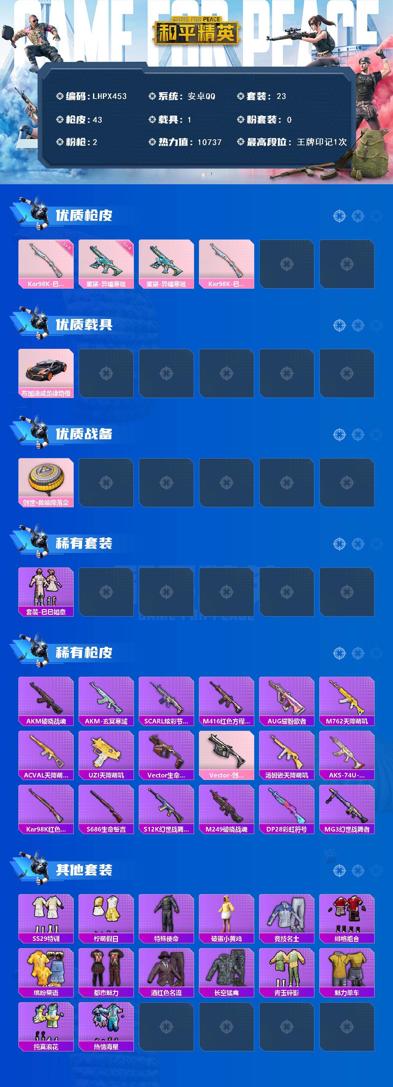 [15579658]【店主推荐捡漏号!可直接换绑】安卓 手Q-0粉装-2特效枪-1载具-1粉色飞行器-10737热力值-1王牌印记-23套装-43枪皮 【粉色枪皮等级】:蜜獾-异瞳寒姬(四级),Kar98K-巳巳如意(五级) 【粉色载具】:布加迪威龙(律动橙) 【粉色枪皮】:蜜獾-异瞳寒姬,Kar98K-巳巳如意 【粉色降落伞】:创世·救赎降落伞,炫彩糖果降落伞 【稀有套装】:套装-巳巳如意,套装-炫彩糖果 【稀有枪皮】:AUG-冰晶雪宝,AKM-破晓战魂,AKM-玄冥寒域,SCAR-L-炫彩节奏,M416-红色方程式,AUG-耀粉歌者,M762-天降萌叽,AC-VAL-天降萌叽,UZI-天降萌叽,Vector-生命誓言,Vector-创世·救赎,汤姆逊-天降萌叽,AKS-74U-鬼刀,Kar98K-红色方程式,S686-生命誓言,S12K-幻世战舞者,M249-破晓战魂,DP-28-彩虹符号,MG3-幻世战舞者 【其他套装】:套装-SS29特训,套装-柠萌假日,套装-特殊使命,套装-破蛋小黄鸡,套装-竞技名士,套装-绯格组合,套装-缤纷果语,套装-都市魅力,套装-酒红色名流,套装-长空猛禽,套装-青玉碎影,套装-魅力单车,套装-纯真浪花,套装-热情海星 【营地ID】:979925537