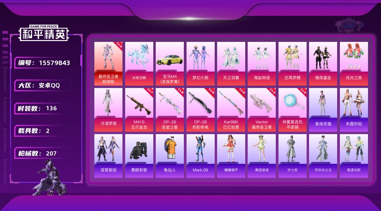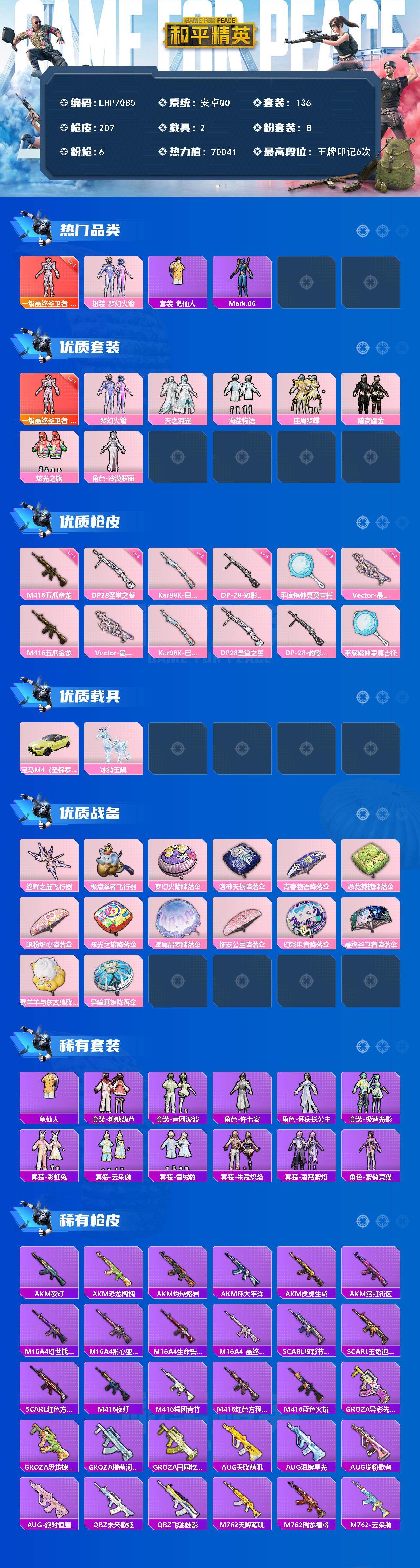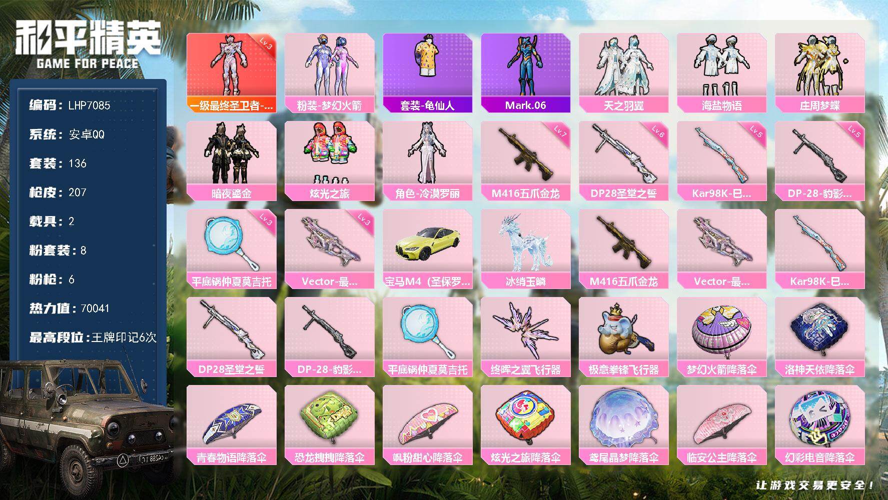 [15579843]【特价出售/店主推荐】安卓 手Q-1神装-8粉装-6特效枪-2载具-4粉色飞行器-7w热力值-6王牌印记-136套装-207枪皮 【红色神装等级】:最终圣卫者-帕修斯(三级) 【红色角色神装】:最终圣卫者-帕修斯 【热门品类】:粉装-梦幻火箭,套装-龟仙人,角色-Mark.06 【粉色套装】:粉装-梦幻火箭,粉装-天之羽翼,粉装-海盐物语,粉装-庄周梦蝶,粉装-暗夜鎏金,粉装-炫光之旅,角色-冷漠罗丽 【粉色枪皮等级】:M416-五爪金龙(七级),Vector-最终圣卫者(三级),Kar98K-巳巳如意(五级),DP-28-圣堂之誓(六级),DP-28-豹影疾电(五级),平底锅-仲夏莫吉托(三级) 【粉色载具】:宝马M4(圣保罗黄),冰绡玉鳞 【粉色枪皮】:M416-五爪金龙,Vector-最终圣卫者,Kar98K-巳巳如意,DP-28-圣堂之誓,DP-28-豹影疾电,平底锅-仲夏莫吉托 【粉色飞行器】:终晖之翼飞行器,极意拳锋飞行器 【粉色降落伞】:梦幻火箭降落伞,洛神天依降落伞,青春物语降落伞,恐龙拽拽降落伞,飒粉甜心降落伞,炫光之旅降落伞,鸢尾晶梦降落伞,临安公主降落伞,幻彩电音降落伞,最终圣卫者降落伞,喜羊羊与灰太狼降落伞,异瞳寒姬降落伞,炫彩糖果降落伞 【稀有套装】:套装-龟仙人,套装-糖糖葫芦,套装-青团波波,角色-许七安,角色-怀庆长公主,套装-极速光影,套装-彩虹兔,套装-云朵鹅,套装-雪绒豹,套装-朱霞炽焰,套装-凌霄紫焰,角色-紫俏灵猫,套装-炫彩糖果 【稀有枪皮】:AUG-冰晶雪宝,AKM-夜灯,AKM-恐龙拽拽,AKM-灼热熔岩,AKM-环太平洋,AKM-虎虎生威,AKM-霓虹街区,M16A4-幻世战舞者,M16A4-甜心亚梦,M16A4-生命誓言,M16A4-最终圣卫者,SCAR-L-炫彩节奏,SCAR-L-玉兔迎春,SCAR-L-红色方程式,M416-夜灯,M416-糯团青竹,M416-红色方程式,M416-蓝色火焰,GROZA-异彩先驱,GROZA-恐龙拽拽,GROZA-懵萌河马,GROZA-田园牧歌,AUG-天降萌叽,AUG-海螺星光,AUG-耀粉歌者,AUG-绝对恒星,QBZ-未来歌姬,QBZ-飞驰魅影,M762-天降萌叽,M762-瑞龙福将,M762-云朵鹅,Mk47-妙红点点,G36C-懵萌河马,AC-VAL-天降萌叽,AC-