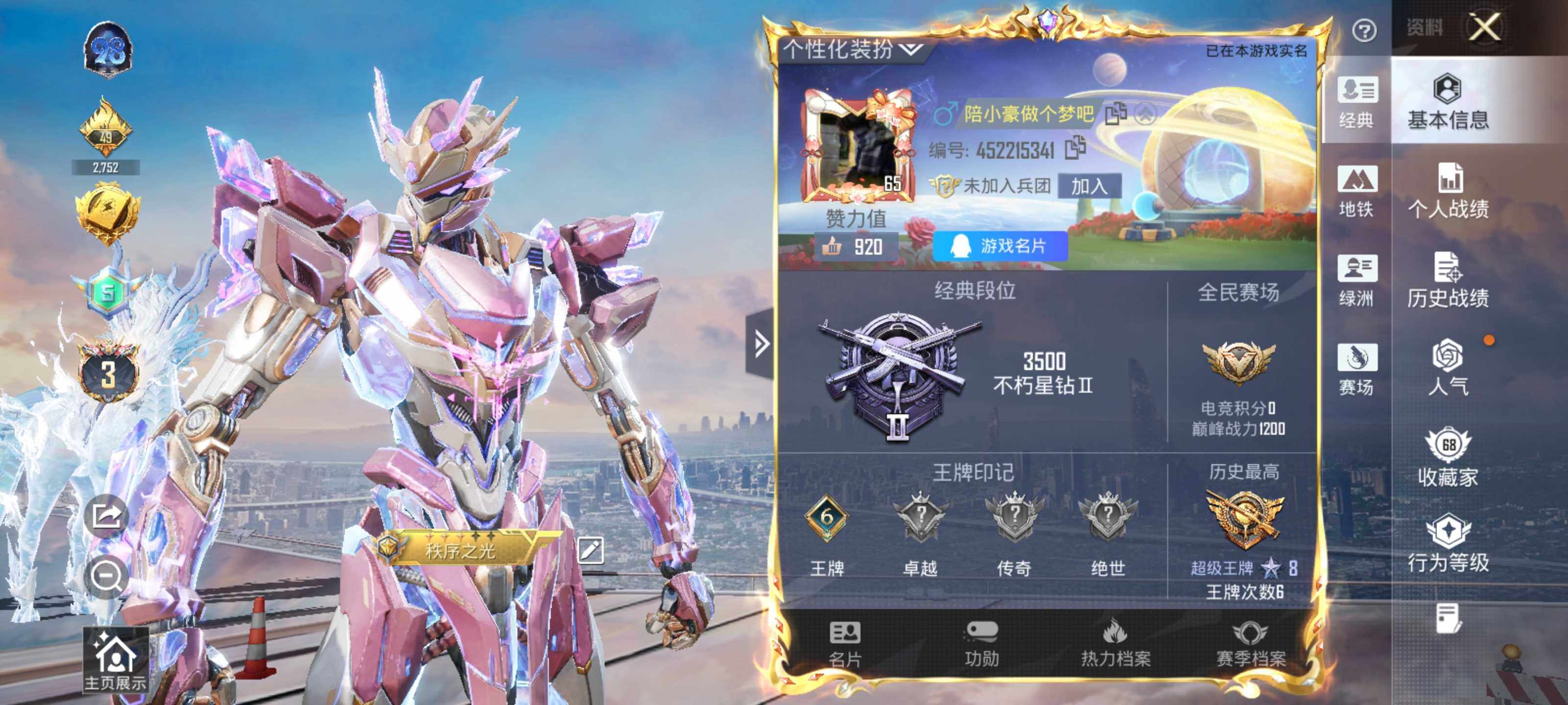 - [12955338]素材身法号/地铁满天赋 安卓 手Q-1神装-7粉装-8特效枪-2载具-3粉色飞行器-8.3w热力值-15王牌印记-197套装-273枪皮【红色神装等级】:宇宙意志-塞卢姆(二级)【热门品类】:粉装-梦幻火箭,套装-奇异狩猎者,套装-金羽特工,套装-忍者信条,套装-浪漫波比,套装-粉红小猪,小恶魔头饰【粉色载具】:双人摩托-梦幻火箭,星梦玉骢【粉色套装】:粉装-宝贝奶油派,粉装-金曜白虎,粉装-梦幻火箭,粉装-恐龙拽拽,角色-白勺歌姬,粉装-BEARBRICK,粉装-幻彩电音【粉色枪皮等级】:AKM-绿萝繁花(五级),SCAR-L-锦绣绵绵(五级),UMP45-宇宙意志(三级),Kar98K-巳巳如意(五级),M417-第五大道(七级),MK12-雪月幻音(三级),DP-28-豹影疾电(五级),爆炸猎弓-拳皇·狂花道(四级)【粉色飞行器】:梦幻火箭飞行器,深渊漩涡飞行器,BEARBRICK飞行器