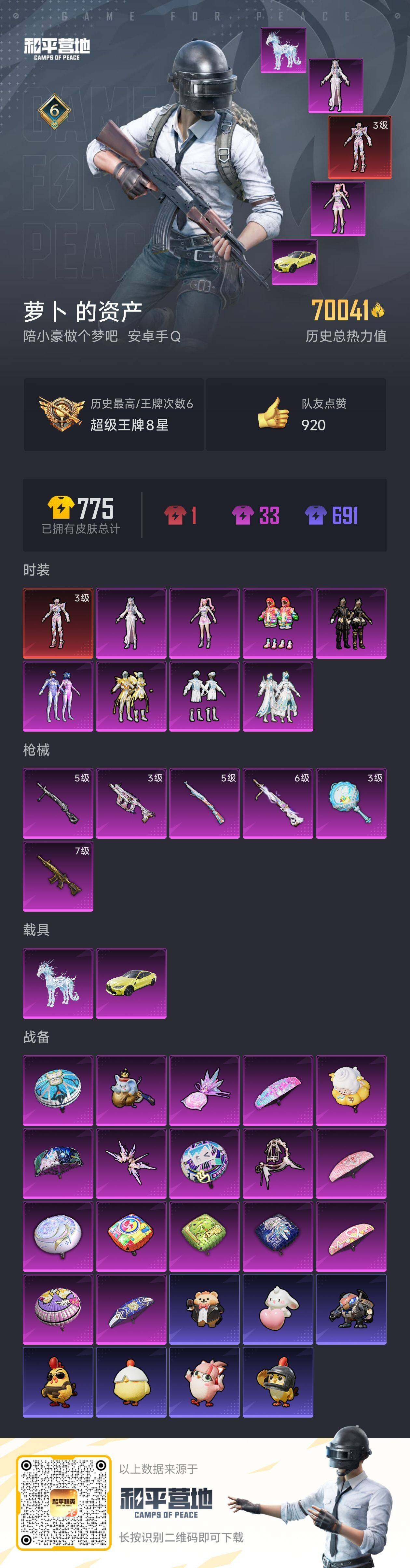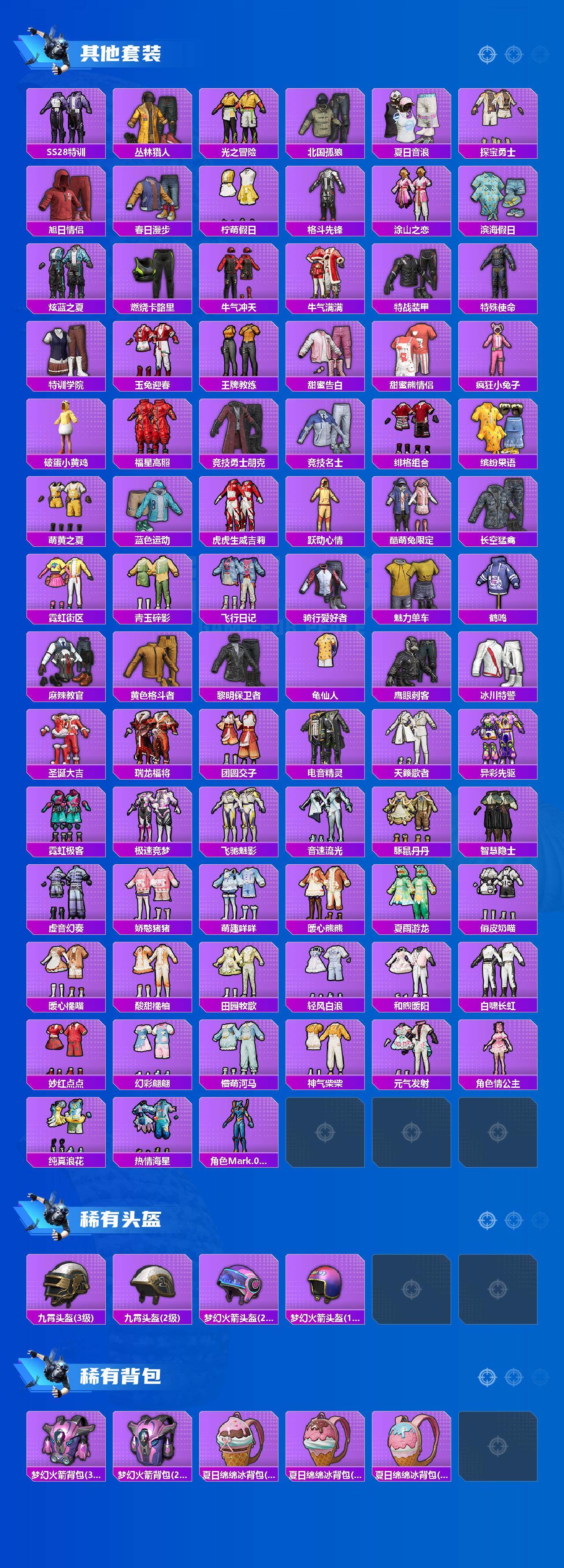 - [15613975]捡漏海外不弹!转不了区!巡查员上衣!11粉装-6特效枪-2载具-2粉色飞行器-71333热力值-15王牌印记-174套装-191枪皮 【热门品类】:绝对防御上衣,套装-小丑鱼,套装-奇异狩猎者,套装-潮萌小黄鸭,套装-浪漫波比 【粉色套装】:粉装-深渊皇后,粉装-天使彩虹糖,粉装-华贵君王,粉装-极致幻想,粉装-幻彩马卡龙,粉装-黄蜂伯爵,粉装-苍蓝魅影,粉装-翡翠骑士,粉装-绚金战神,粉装-香水柠檬,角色-洛天依 【粉色枪皮等级】:AKM-炫紫旋律(六级),M416-心之恋语(五级),M762-激战未来(六级),Kar98K-巳巳如意(一级),Mini14-荧光虫舞(四级),MG3-洛神天依(五级) 【粉色载具】:特斯拉Model 3(珍珠白),兰博基尼Estoque(银翼灰) 【粉色枪皮】:AKM-炫紫旋律,M416-心之恋语,M762-激战未来,Kar98K-巳巳如意,Mini14-荧光虫舞,MG3-洛神天依 【粉色飞行器】:精灵迷巫飞行器,齐天大圣飞行器 【粉色降落伞】:雪国幻梦降落伞,春暖花开降落伞,神秘黑猫降落伞,古堡领主降落伞,荧光虫舞降落伞,香水柠檬降落伞,王牌四分卫降落伞,怪笑疯兔降落伞,齐天大圣降落伞,洛神天依降落伞,风花雪月降落伞 【稀有套装】:套装-巳巳如意 【稀有枪皮】:AKM-夜灯,AKM-彩虹符号,AKM-星之彼岸,AKM-春暖花开,AKM-灼热熔岩,AKM-萌趣颜团子,AKM-虎虎生威,M16A4-夜灯,M16A4-幻世战舞者,M16A4-机械英豪,SCAR-L-暗夜玫瑰,SCAR-L-炫彩节奏,SCAR-L-玉兔迎春,M416-仓鼠灰灰,M416-夜灯,M416-蓝色火焰,GROZA-异彩先驱,GROZA-彩虹符号,GROZA-春暖花开,GROZA-梨园星光,GROZA-治愈之星,GROZA-蓝莓炮弹,GROZA-马卡龙,GROZA-黑色刀锋,AUG-凝视深渊,AUG-天降萌叽,AUG-耀粉歌者,AUG-青春冒险家,QBZ-原初圣火,QBZ-彩虹符号,QBZ-洛神天依,QBZ-潮汐统领,QBZ-电玩视界,QBZ-神秘黑猫,QBZ-赛罗,M762-奇异狩猎者,M762-拳皇97,M762-深海曼妙,M762-牛气冲天,M762-瑞龙福将,M762-镭射皇者,Mk47-洛神天依,Mk47-青春冒险家,G36C-不夜海上花,G36C-时