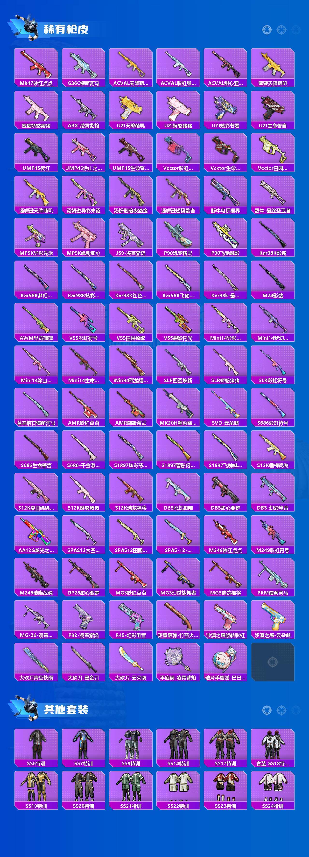 【稀有枪皮】:AUG-冰晶雪宝,AKM-夜灯,AKM-恐龙拽拽,AKM-灼热熔岩,AKM-环太平洋,AKM-虎虎生威,AKM-霓虹街区,M16A4-幻世战舞者,M16A4-甜心亚梦,M16A4-生命誓言,M16A4-最终圣卫者,SCAR-L-炫彩节奏,SCAR-L-玉兔迎春,SCAR-L-红色方程式,M416-夜灯,M416-糯团青竹,M416-红色方程式,M416-蓝色火焰,GROZA-异彩先驱,GROZA-恐龙拽拽,GROZA-懵萌河马,GROZA-田园牧歌,AUG-天降萌叽,AUG-海螺星光,AUG-耀粉歌者,AUG-绝对恒星,QBZ-未来歌姬,QBZ-飞驰魅影,M762-天降萌叽,M762-瑞龙福将,M762-云朵鹅,Mk47-妙红点点,G36C-懵萌河马,AC-VAL-天降萌叽,AC-