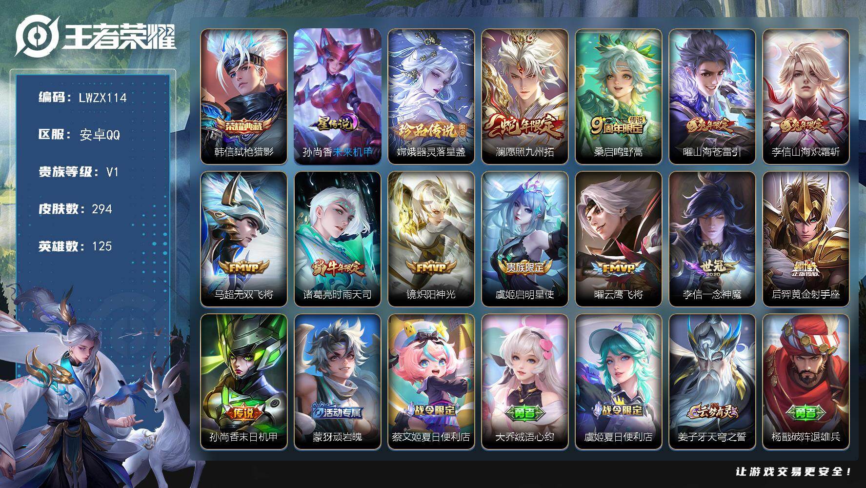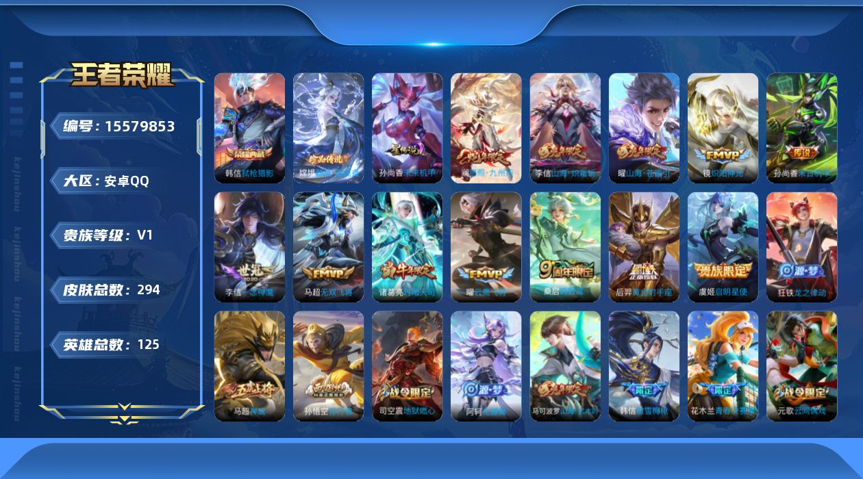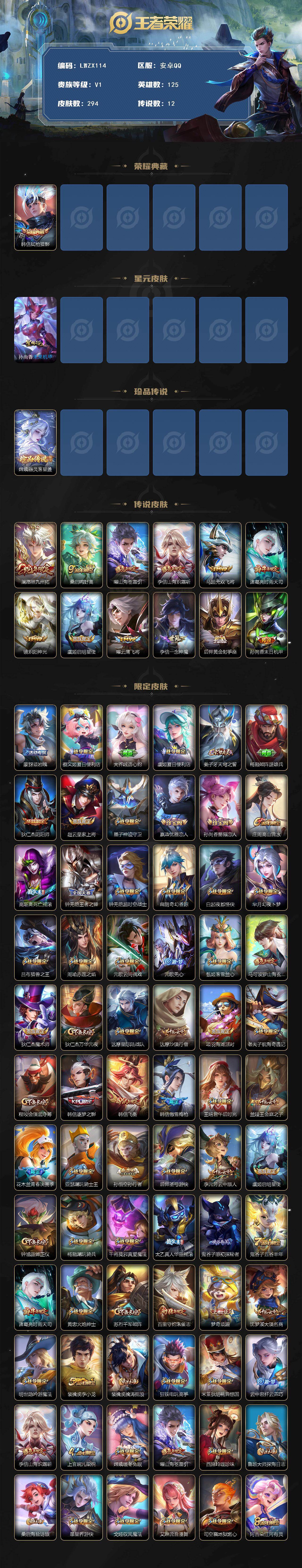 [15579853]【特价出售/店主推荐】安卓Q-V8-永恒钻石I段位-125英雄-294皮肤-1典藏皮肤-1珍品传说-1星传-12传说-92史诗