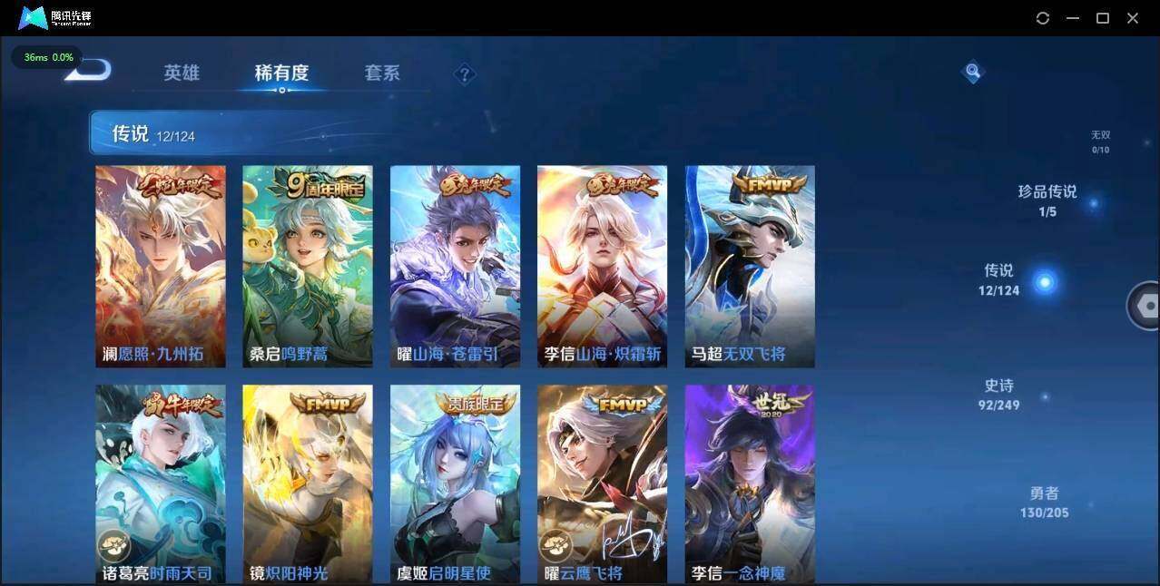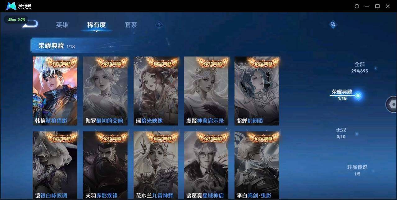 【传说皮肤】:澜愿照九州拓,桑启鸣野蒿,曜山海苍雷引,李信山海炽霜斩,马超无双飞将,诸葛亮时雨天司,镜炽阳神光,虞姬启明星使,曜云鹰飞将,李信一念神魔,后羿黄金射手座,孙尚香末日机甲