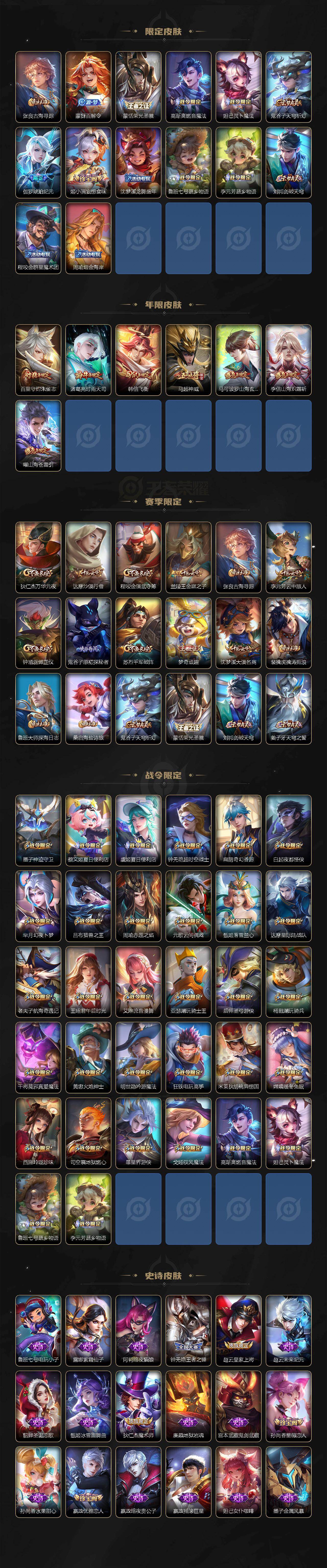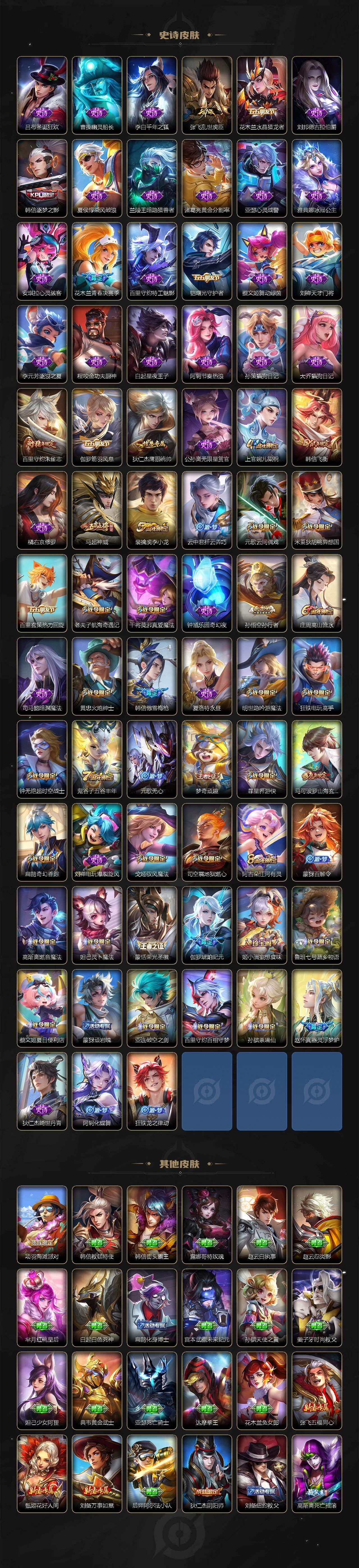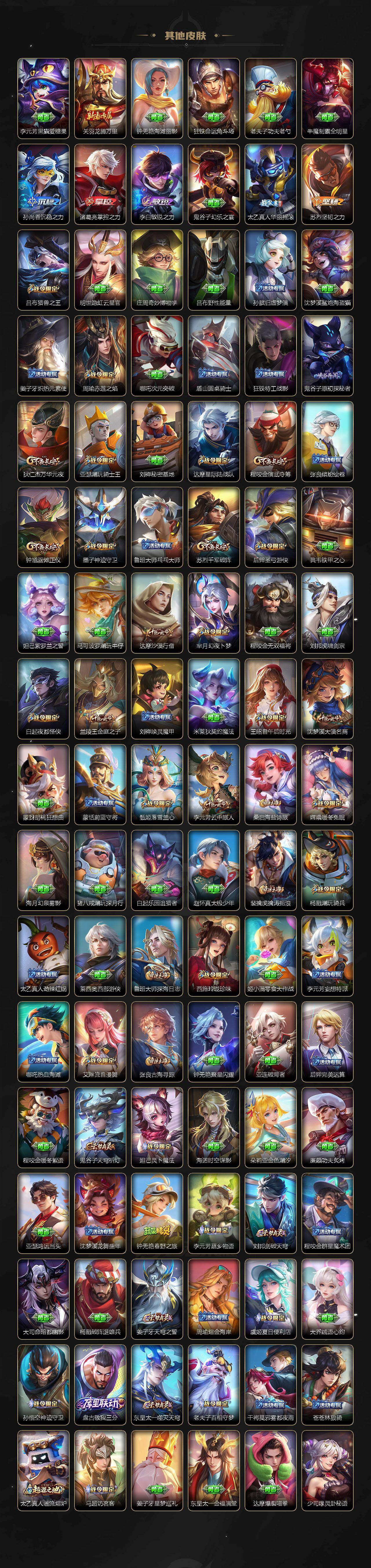 【限定皮肤】:蒙犽顽岩魄,蔡文姬夏日便利店,大乔绒语心约,虞姬夏日便利店,姜子牙天穹之誓,杨戬破阵退雄兵,狄仁杰阴阳师,赵云皇家上将,墨子神迹守卫,嬴政优雅恋人,孙尚香蔷薇恋人,庄周高山流水,高渐离死亡摇滚,钟无艳王者之锤,钟无艳超时空战士,扁鹊奇幻香踪,白起夜都怪侠,芈月幻夜卜梦,吕布猎兽之王,周瑜赤莲之焰,元歌云间偶戏,元歌无心,甄姬落雪兰心,马可波罗山海玄木吟,狄仁杰魔术师,狄仁杰万华元夜,达摩星际陆战队,达摩沙漠行僧,项羽海滩派对,老夫子航海奇遇记,程咬金演武夺筹,韩信逐梦之影,韩信飞衡,韩信傲雪梅枪,王昭君午后时光,兰陵王金庭之子,花木兰青春决赛季,亚瑟潮玩骑士王,孙悟空孙行者,后羿圣弓游侠,李元芳云中旅人,虞姬启明星使,钟馗驱傩正仪,杨戬潮玩骑兵,干将莫邪真爱魔法,太乙真人华丽摇滚,鬼谷子原初探秘者,鬼谷子五谷丰年,诸葛亮时雨天司,黄忠火炮绅士,苏烈千军破阵,百里守约朱雀志,梦奇顽趣,沈梦溪大漠名商,明世隐吟游魔法,裴擒虎李小龙,裴擒虎擒涛扼浪,狂铁电玩高手,米莱狄胡桃异想国,云中君纤云弄巧,李信山海炽霜斩,上官婉儿梁祝,嫦娥暖冬兔眠,曜山海苍雷引,西施玲珑珍味,鲁班大师探海日志,桑启海盐诗旅,暃星界游侠,戈娅驭风魔法,艾琳流音漫舞,司空震地狱燃心,阿古朵江河有灵,张良古海寻踪,蒙犽百解令,蒙恬荣光圣徽,高渐离燃音魔法,妲己灵卜魔法,鬼谷子天穹祈灯,伽罗琥珀纪元,姬小满妄想食味,沈梦溪龙舞盛年,鲁班七号蔬乡物语,李元芳蔬乡物语,刘邦剑破天穹,程咬金群星魔术团,周瑜熔金海岸