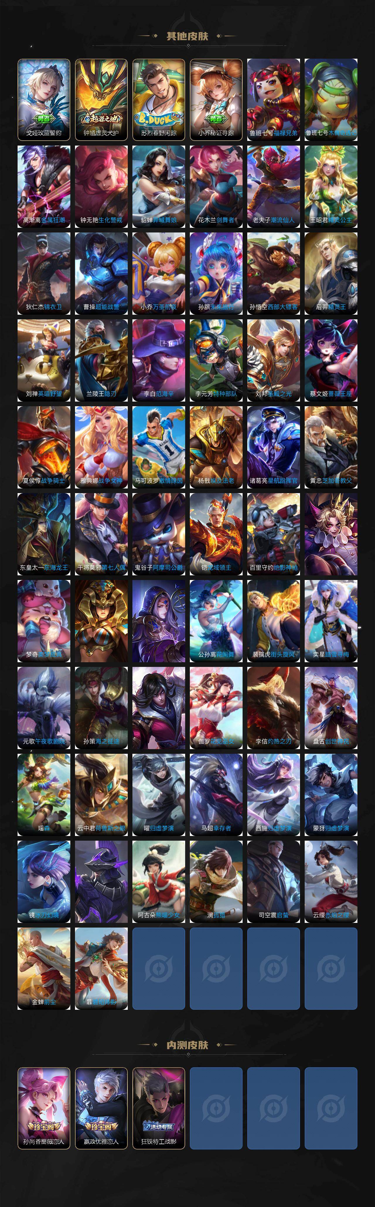 伽罗箭羽风息,李元芳逐浪之夏,公孙离无限星赏官,大乔猫狗日记,孙策猫狗日记,阿轲节奏热浪,露娜紫霞仙子,诸葛亮黄金分割率,阿轲暗夜猫娘,雅典娜冰冠公主,鲁班七号电玩小子,橘右京修罗,嬴政摇滚巨星,刘禅天才门将,白起星夜王子,安琪拉心灵骇客,程咬金功夫厨神,刘邦德古拉伯爵,兰陵王暗隐猎兽者,曹操幽灵船长,宫本武藏鬼剑武藏,司马懿暗渊魔法,亚瑟心灵战警,钟馗乐园奇幻夜,蔡文姬舞动绿茵,廉颇地狱岩魂,夏侯惇乘风破浪,花木兰水晶猎龙者,铠曙光守护者,百里玄策热力回旋,墨子金属风暴,吕布圣诞狂欢,貂蝉圣诞恋歌,百里守约特工魅影,嬴政暗夜贵公子,李白千年之狐,夏洛特永昼,刘禅电玩·爆裂旋风,蒙犽百解令,高渐离燃音魔法,伽罗琥珀纪元,赵怀真器灵·浮梦炉,狄仁杰绮世丹青