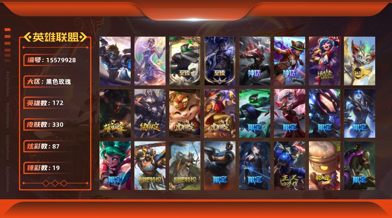 [15579928]未定级段位-172英雄-330皮肤-87炫彩-2终极-5神话-72限定-33传说-44史诗