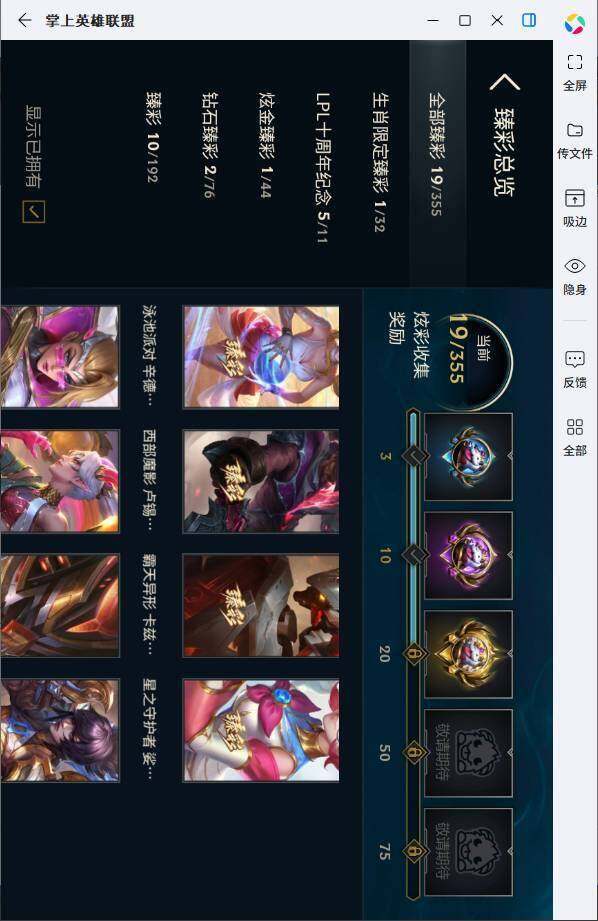 【臻彩皮肤】:天龙之子卡莎飞龙乘云,巅峰剑仙菲奥娜天神下凡,无畏圣弩薇恩绝境狂杀,无畏游侠卢锡安不败圣枪,无畏骑士瑟庄妮赤子初心,无畏意志墨菲特必不可挡,冠军之刃锐雯2016凯旋圣装,神龙尊者圣龙李青登龙,西部魔影卢锡安贝利尔之怠,星之守护者娑娜未来之光,泳池派对辛德拉荔枝枝连击,霸天异形卡兹克刹那银光,可爱可爱粉红红布里茨,魔女阿卡丽虚荣,净雪之月莫甘娜冬虹,玉剑传说星仙子丁香,斗魂觉醒伊芙琳幻之魂焰,咖啡甜心璐璐海盐泡芙
