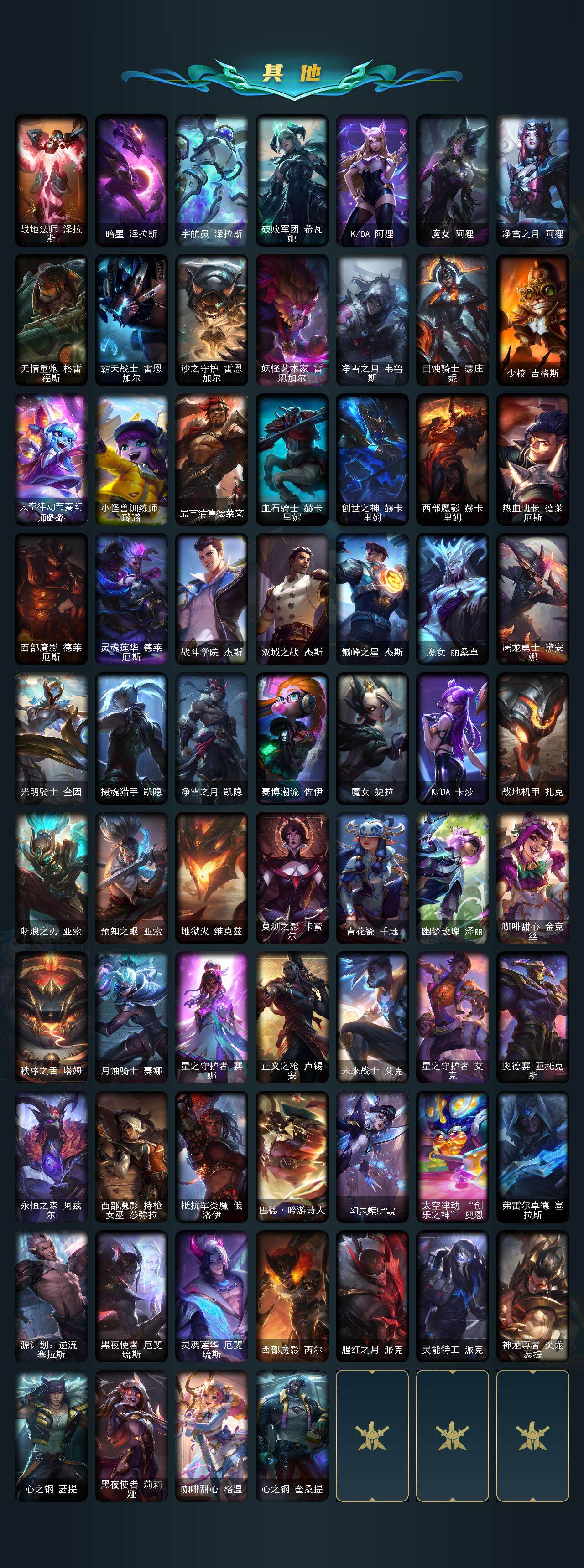 【限定皮肤】:冠军之箭艾希,Fnatic古拉加斯,Fnatic迦娜,暗杀星蒙多,SSW辛吉德,SSW雷恩加尔,SSW锤石,SKTT1瑞兹,SKTT1奥拉夫,SKTT1扎克,iG菲奥娜,iG乐芙兰,DWG烬,DWG蕾欧娜,EDG格雷福斯,EDG佛耶戈,DRX亚托克斯,DRX阿卡丽,玉剑传说舞剑仙,暗裔英雄盖伦,胜利之王泰达米尔,胜利巨口克格莫,胜利女神娑娜,胜利剑圣易,海贼瑞兹,灵魂收割者索拉卡,南瓜头王子阿木木,鬼影重重魔腾,鬼影森森茂凯,魅惑女巫奈德丽,魅惑女巫波比,泳池派对布隆,泳池派对黑默丁格,泳池派对嘉文四世,泳池派对雷克顿,泳池派对蕾欧娜,泳池派对瑟提,泳池派对佐伊,怦然心动凯特琳,野兽猎人瑟庄妮,野兽猎人泰达米尔,波比的巧克力工坊,御星魔矢艾希,战场BOSS吉格斯,征服者贾克斯,征服者卡尔玛,防暴士兵格雷福斯,防暴天使凯尔,海之歌萨勒芬妮,海之歌泽丽,双城之战2微光实验室辛吉德