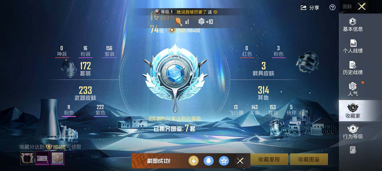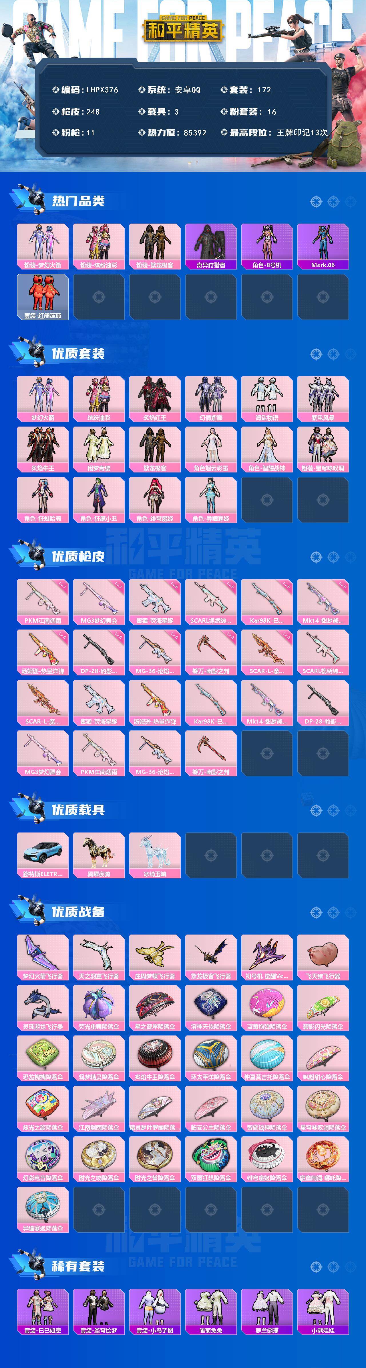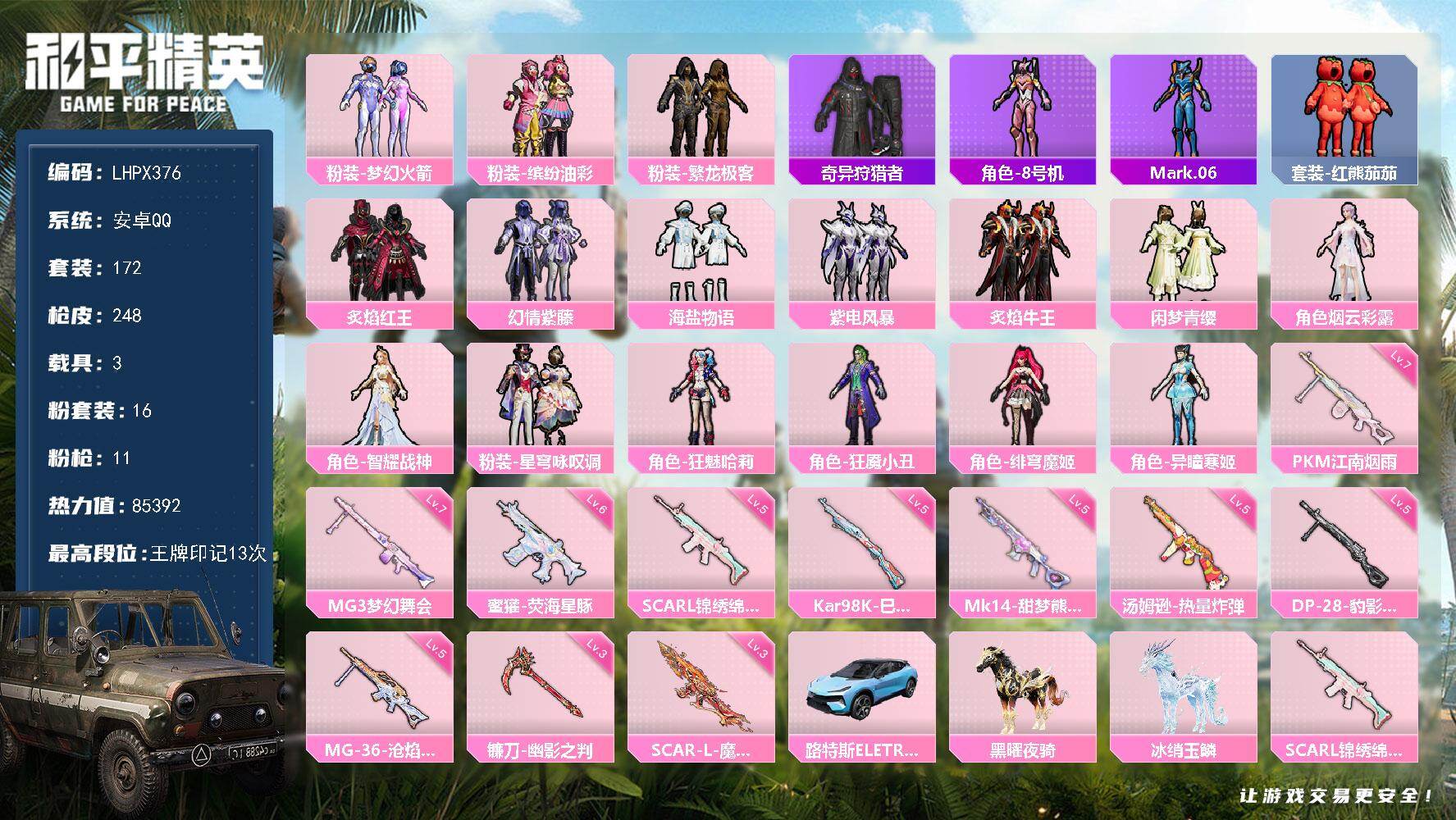 [15579935]安卓 手Q-16粉装-11特效枪-3载具-9粉色飞行器-85392热力值-13王牌印记-172套装-248枪皮