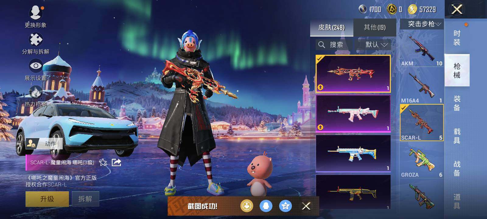 【粉色枪皮等级】:SCAR-L-锦绣绵绵(五级),SCAR-L-魔童闹海 哪吒(三级),蜜獾-荧海星豚(六级),汤姆逊-热量炸弹(五级),Kar98K-巳巳如意(五级),Mk14-甜梦熊击(五级),DP-28-豹影疾电(五级),MG3-梦幻舞会(七级),PKM-江南烟雨(七级),MG-36-沧焰双生(五级),镰刀-幽影之判(三级)