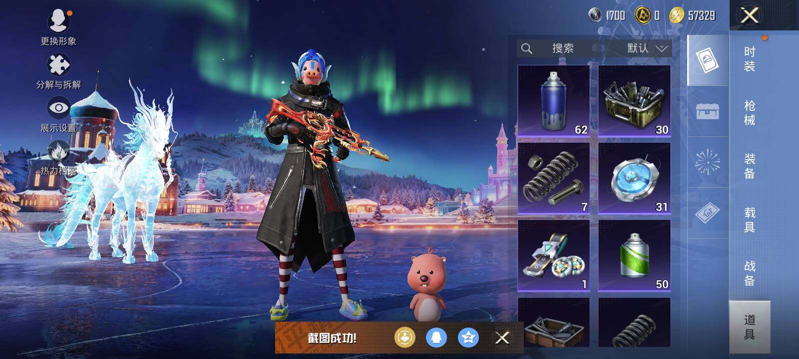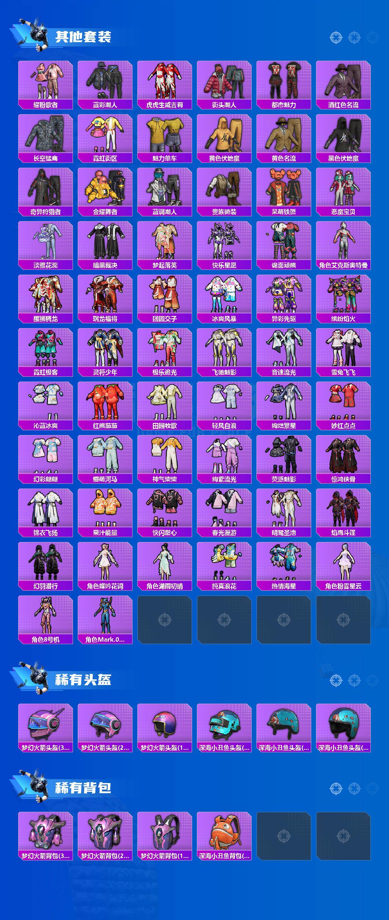 套装-梦幻火箭,套装-缤纷油彩,套装-繁龙极客,套装-奇异狩猎者,套装-炙焰红王,套装-幻情紫藤,套装-海盐物语,套装-紫电风暴,套装-炙焰牛王,套装-闲梦青缨,角色-烟云彩露,套装-呆萌铁蟹