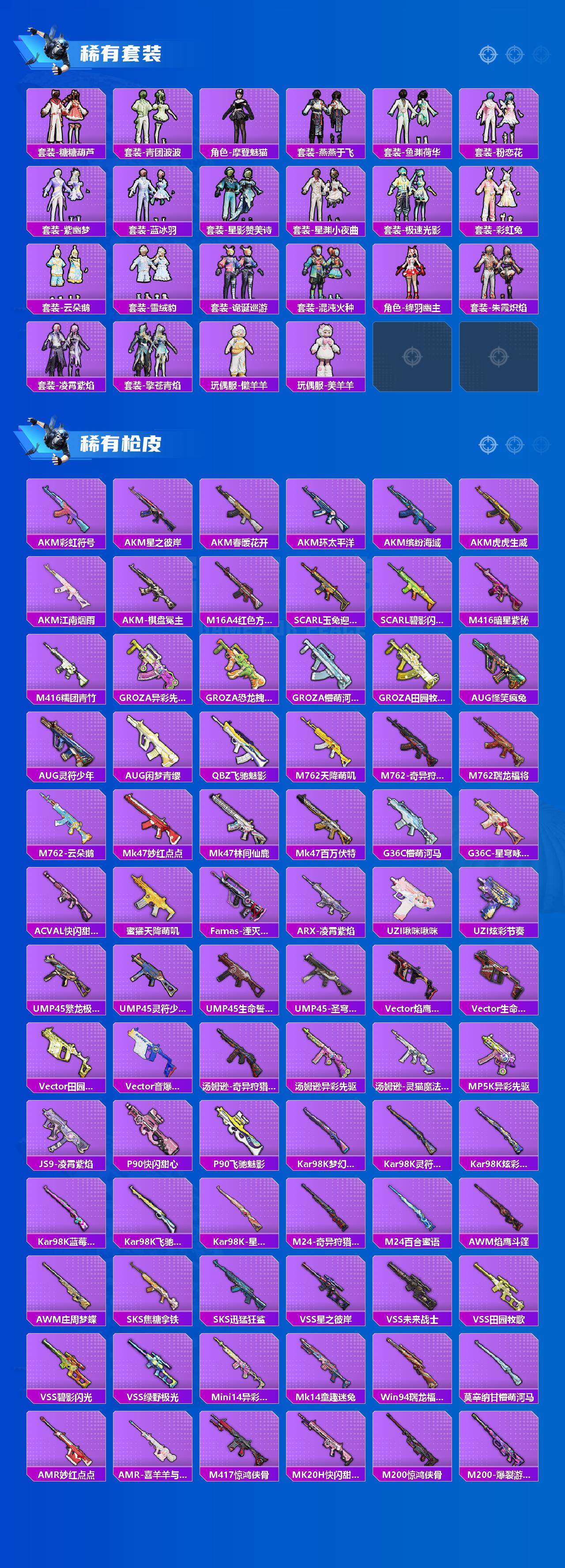 AKM-缤纷海域,M762-奇异狩猎者,M762-瑞龙福将,Mk47-林间仙鹿,M24-奇异狩猎者,S686-奇异狩猎者