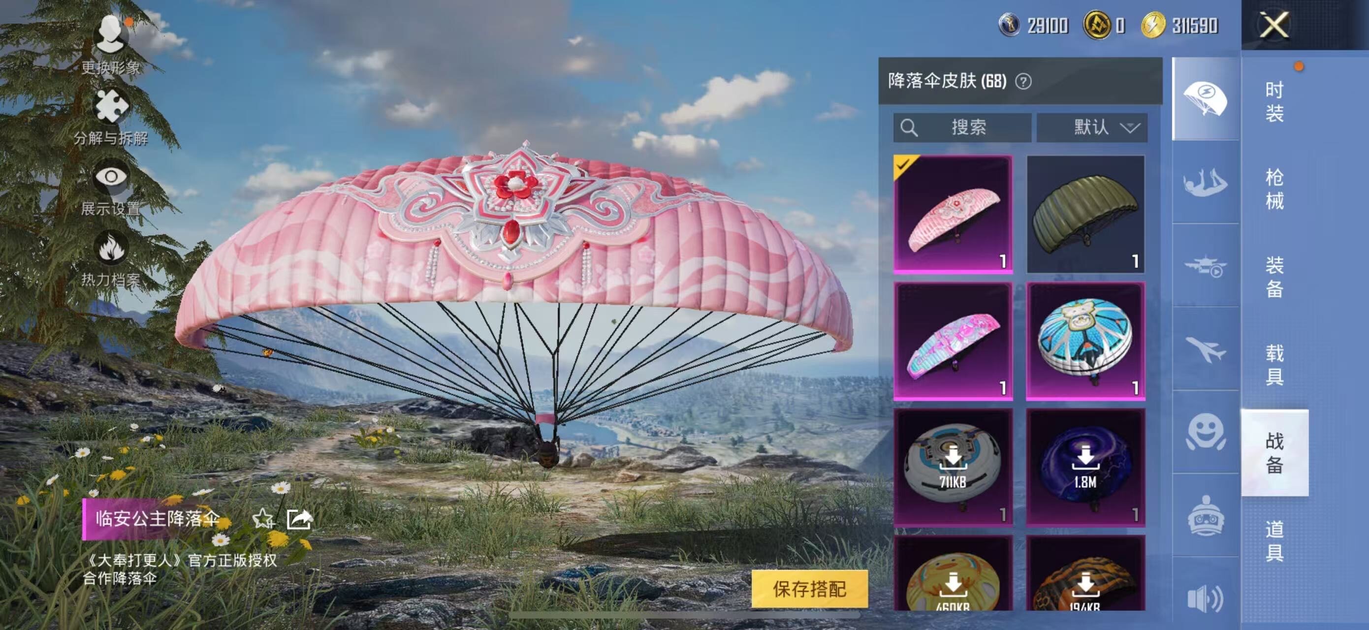 【粉色降落伞】:烈焰拳霸降落伞,垂柳戏鸭降落伞,宇宙意志降落伞,未来领航者降落伞,临安公主降落伞,异瞳寒姬降落伞,炫彩糖果降落伞