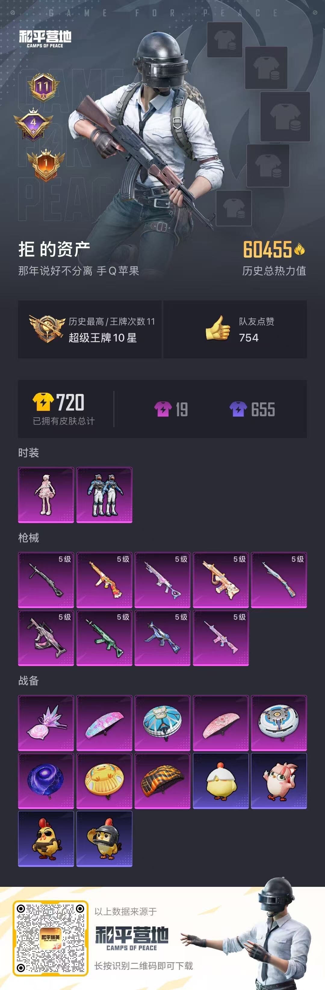 [15579942]苹果 手Q-2粉装-9特效枪-0载具-1粉色飞行器-60455热力值-11王牌印记-141套装-210枪皮