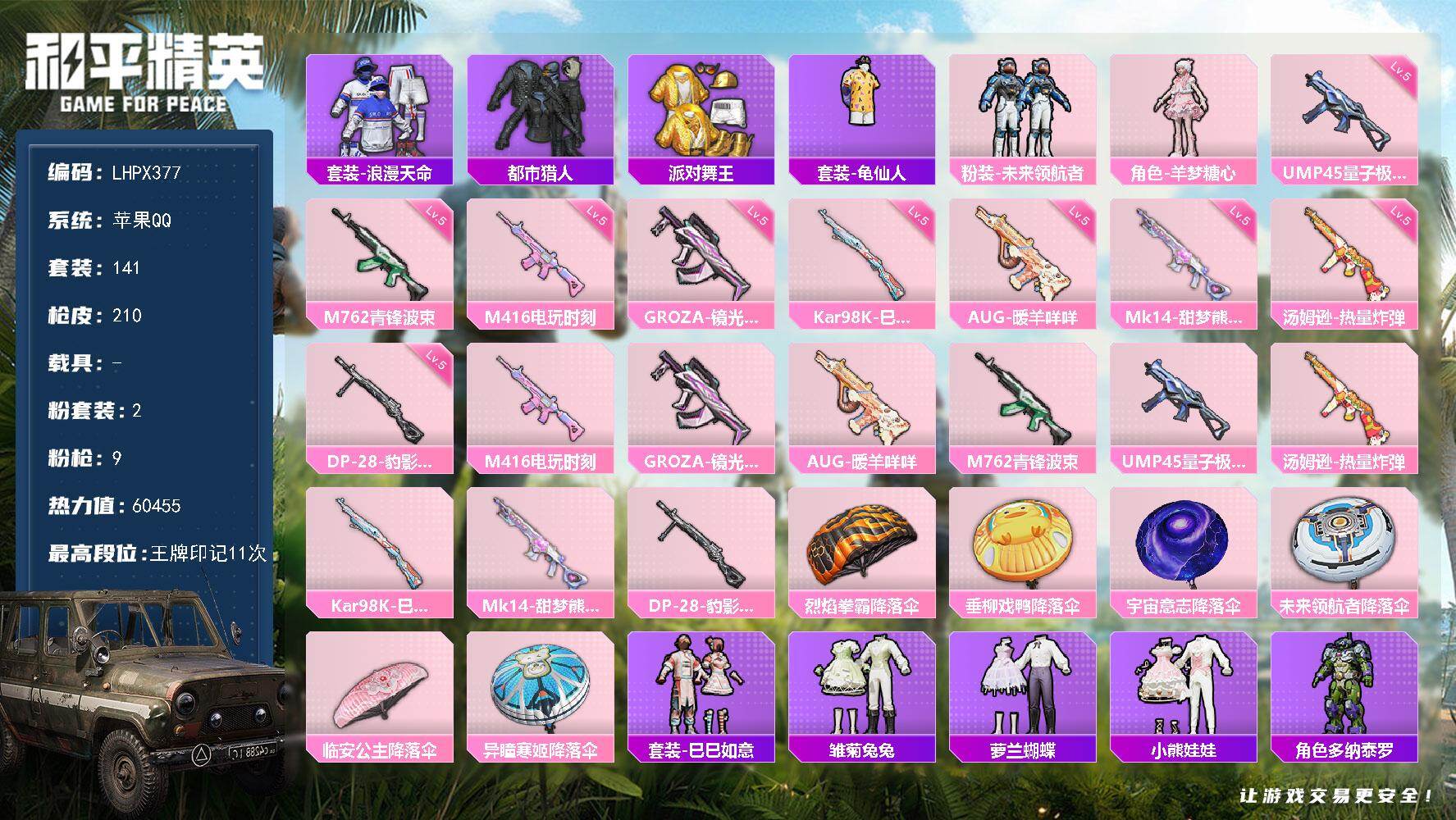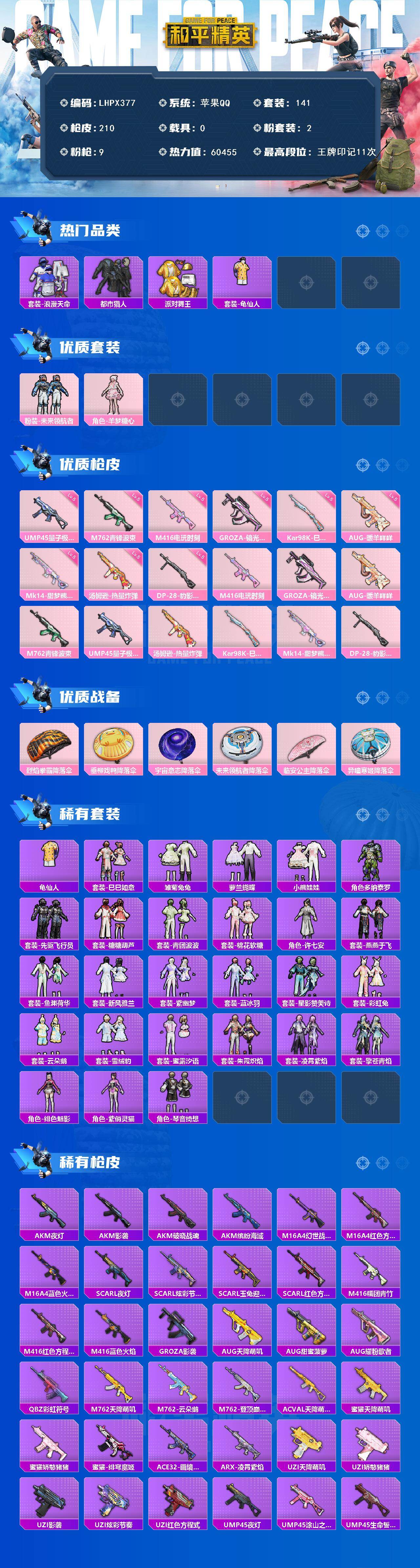 [15579942]苹果 手Q-2粉装-9特效枪-0载具-1粉色飞行器-60455热力值-11王牌印记-141套装-210枪皮 【热门品类】:套装-浪漫天命,套装-都市猎人,套装-派对舞王,套装-龟仙人 【粉色套装】:粉装-未来领航者,角色-羊梦糖心 【粉色枪皮等级】:M416-电玩时刻(五级),GROZA-镜光银凌(五级),AUG-暖羊咩咩(五级),M762-青锋波束(五级),UMP45-量子极限(五级),汤姆逊-热量炸弹(五级),Kar98K-巳巳如意(五级),Mk14-甜梦熊击(五级),DP-28-豹影疾电(五级) 【粉色枪皮】:M416-电玩时刻,GROZA-镜光银凌,AUG-暖羊咩咩,M762-青锋波束,UMP45-量子极限,汤姆逊-热量炸弹,Kar98K-巳巳如意,Mk14-甜梦熊击,DP-28-豹影疾电 【粉色降落伞】:烈焰拳霸降落伞,垂柳戏鸭降落伞,宇宙意志降落伞,未来领航者降落伞,临安公主降落伞,异瞳寒姬降落伞,炫彩糖果降落伞 【稀有套装】:套装-龟仙人,套装-巳巳如意,套装-雏菊兔兔,套装-萝兰蝴蝶,套装-小熊娃娃,角色-多纳泰罗,套装-先驱飞行员,套装-糖糖葫芦,套装-青团波波,套装-棉花软糖,角色-许七安,套装-燕燕于飞,套装-鱼渊荷华,套装-新风雅兰,套装-紫幽梦,套装-蓝冰羽,套装-星影赞美诗,套装-彩虹兔,套装-云朵鹅,套装-雪绒豹,套装-蜜露汐语,套装-朱霞炽焰,套装-凌霄紫焰,套装-擎苍青焰,角色-绯色魅影,角色-紫俏灵猫,套装-琴音绮想,套装-炫彩糖果 【稀有枪皮】:AUG-冰晶雪宝,AKM-夜灯,AKM-影袭,AKM-破晓战魂,AKM-缤纷海域,M16A4-幻世战舞者,M16A4-红色方程式,M16A4-蓝色火焰,SCAR-L-夜灯,SCAR-L-炫彩节奏,SCAR-L-玉兔迎春,SCAR-L-红色方程式,M416-糯团青竹,M416-红色方程式,M416-蓝色火焰,GROZA-影袭,AUG-天降萌叽,AUG-甜蜜菠萝,AUG-耀粉歌者,QBZ-彩虹符号,M762-天降萌叽,M762-云朵鹅,M762-登顶巅峰,AC-VAL-天降萌叽,蜜獾-天降萌叽,蜜獾-娇憨猪猪,蜜獾-绯穹魔姬,ACE32-画境星梦,ARX-凌霄紫焰,UZI-天降萌叽,UZI-娇憨猪猪,UZI-影袭,UZI-炫彩节奏,UZI-红色方程式,UMP45-夜灯,UMP45-涂山之恋