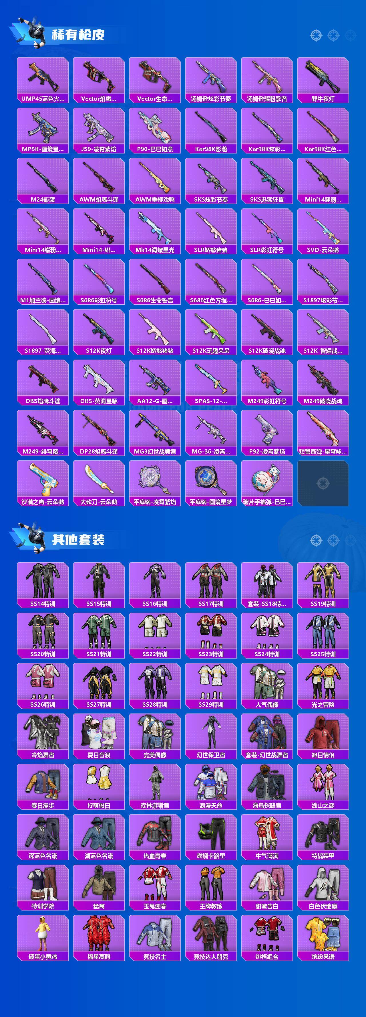 【稀有枪皮】:AUG-冰晶雪宝,AKM-夜灯,AKM-影袭,AKM-破晓战魂,AKM-缤纷海域,M16A4-幻世战舞者,M16A4-红色方程式,M16A4-蓝色火焰,SCAR-L-夜灯,SCAR-L-炫彩节奏,SCAR-L-玉兔迎春,SCAR-L-红色方程式,M416-糯团青竹,M416-红色方程式,M416-蓝色火焰,GROZA-影袭,AUG-天降萌叽,AUG-甜蜜菠萝,AUG-耀粉歌者,QBZ-彩虹符号,M762-天降萌叽,M762-云朵鹅,M762-登顶巅峰,AC-VAL-天降萌叽,蜜獾-天降萌叽,蜜獾-娇憨猪猪,蜜獾-绯穹魔姬,ACE32-画境星梦,ARX-凌霄紫焰,UZI-天降萌叽,UZI-娇憨猪猪,UZI-影袭,UZI-炫彩节奏,UZI-红色方程式,UMP45-夜灯,UMP45-涂山之恋