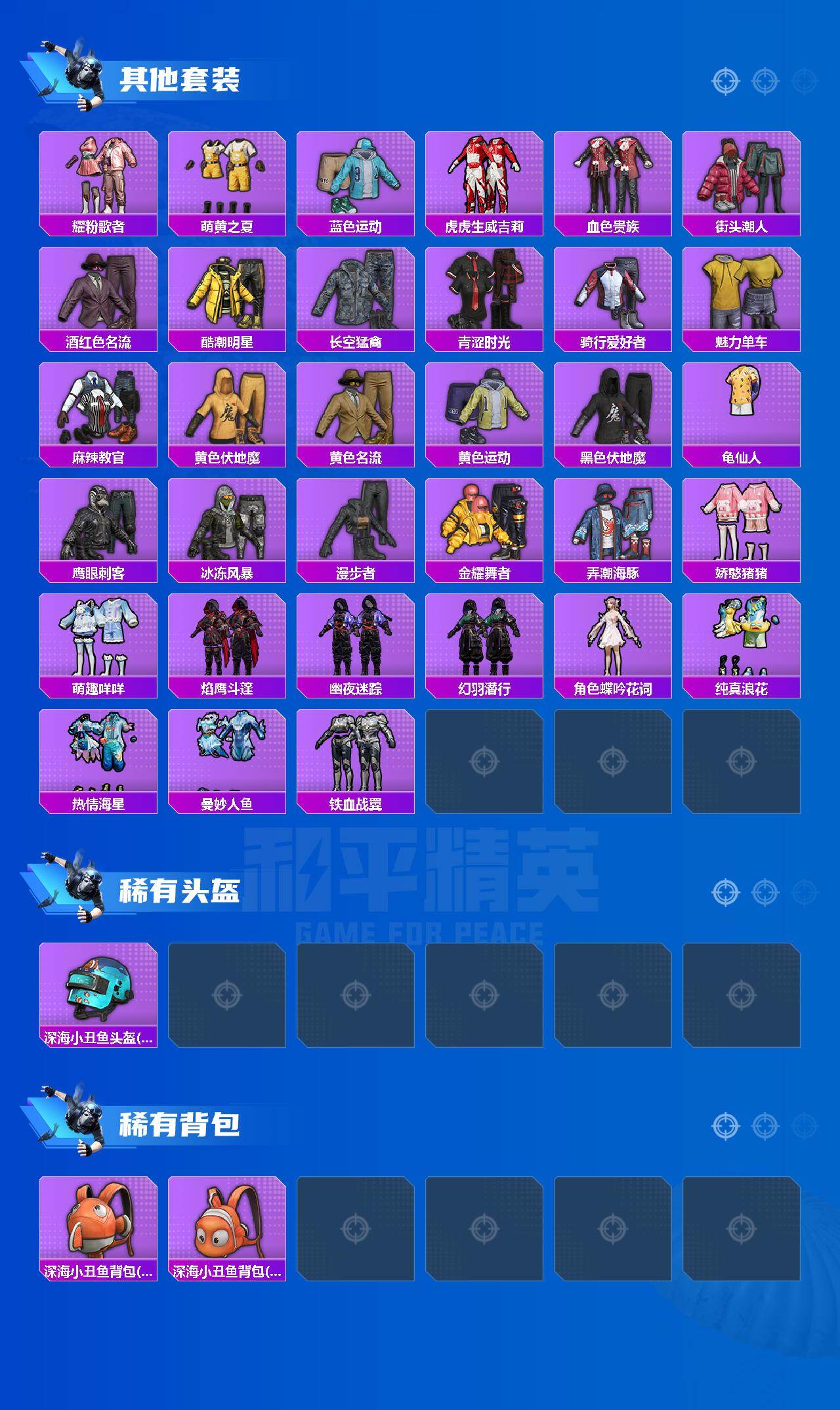 【稀有套装】:套装-龟仙人,套装-巳巳如意,套装-雏菊兔兔,套装-萝兰蝴蝶,套装-小熊娃娃,角色-多纳泰罗,套装-先驱飞行员,套装-糖糖葫芦,套装-青团波波,套装-棉花软糖,角色-许七安,套装-燕燕于飞,套装-鱼渊荷华,套装-新风雅兰,套装-紫幽梦,套装-蓝冰羽,套装-星影赞美诗,套装-彩虹兔,套装-云朵鹅,套装-雪绒豹,套装-蜜露汐语,套装-朱霞炽焰,套装-凌霄紫焰,套装-擎苍青焰,角色-绯色魅影,角色-紫俏灵猫,套装-琴音绮想,套装-炫彩糖果
