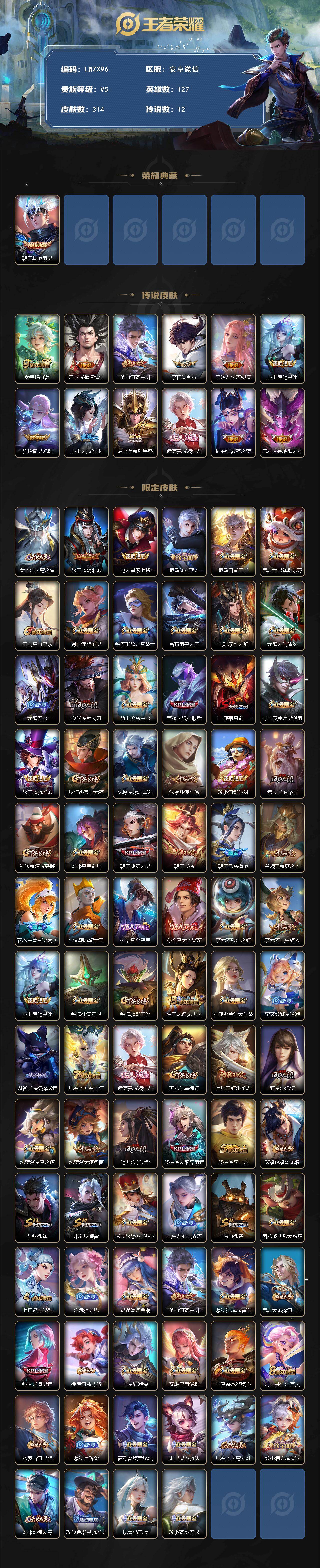 [15580105]【特价出售/店主推荐】安卓WX-V5-永恒钻石IV段位-127英雄-314皮肤-1典藏皮肤-12传说-93史诗 【英雄全皮】:空空儿全皮,影全皮 【荣耀典藏】:韩信弑枪猎影 【传说皮肤】:桑启鸣野蒿,宫本武藏惊梅引,曜山海苍雷引,李白诗剑行,王昭君乞巧织情,虞姬启明星使,貂蝉猫影幻舞,虞姬云霓雀翎,后羿黄金射手座,诸葛亮武陵仙君,貂蝉仲夏夜之梦,宫本武藏地狱之眼 【限定皮肤】:姜子牙天穹之誓,狄仁杰阴阳师,赵云皇家上将,嬴政优雅恋人,嬴政白昼王子,鲁班七号狮舞东方,庄周高山流水,阿轲迷踪丽影,钟无艳超时空战士,吕布猎兽之王,周瑜赤莲之焰,元歌云间偶戏,元歌无心,夏侯惇朔风刀,甄姬落雪兰心,曹操天狼征服者,典韦穷奇,马可波罗暗影游猎,狄仁杰魔术师,狄仁杰万华元夜,达摩星际陆战队,达摩沙漠行僧,项羽海滩派对,老夫子醍醐杖,程咬金演武夺筹,刘邦夺宝奇兵,韩信逐梦之影,韩信飞衡,韩信傲雪梅枪,兰陵王金庭之子,花木兰青春决赛季,亚瑟潮玩骑士王,孙悟空至尊宝,孙悟空大圣娶亲,李元芳银河之约,李元芳云中旅人,虞姬启明星使,钟馗神迹守卫,钟馗驱傩正仪,杨玉环遇见飞天,雅典娜单词大作战,蔡文姬繁星吟游,鬼谷子原初探秘者,鬼谷子五谷丰年,诸葛亮武陵仙君,苏烈千军破阵,百里守约朱雀志,弈星混沌棋,沈梦溪星空之诺,沈梦溪大漠名商,明世隐疑决卦,裴擒虎天狼狩猎者,裴擒虎李小龙,裴擒虎擒涛扼浪,狂铁御狮,米莱狄御霄,米莱狄胡桃异想国,云中君纤云弄巧,盾山御銮,猪八戒西部大镖客,上官婉儿梁祝,嫦娥拒霜思,嫦娥暖冬兔眠,曜山海苍雷引,蒙犽狂想玩偶喵,鲁班大师探海日志,镜匿光追影者,桑启海盐诗旅,暃星界游侠,艾琳流音漫舞,司空震地狱燃心,阿古朵江河有灵,张良古海寻踪,蒙犽百解令,高渐离燃音魔法,妲己灵卜魔法,鬼谷子天穹祈灯,姬小满妄想食味,刘邦剑破天穹,程咬金群星魔术团,镜青焰无极,项羽苍威无极 【年限皮肤】:百里守约朱雀志,韩信飞衡,曜山海苍雷引 【赛季限定】:夏侯惇朔风刀,典韦穷奇,狄仁杰万华元夜,达摩沙漠行僧,老夫子醍醐杖,程咬金演武夺筹,兰陵王金庭之子,张良古海寻踪,李元芳云中旅人,钟馗驱傩正仪,鬼谷子原初探秘者,苏烈千军破阵,弈星混沌棋,沈梦溪大漠名商,明世隐疑决卦,裴擒虎擒涛扼浪,狂铁御狮,米莱狄御霄,盾山御銮,鲁班大师探海日志,桑启海盐诗旅,鬼谷子天穹祈灯,刘邦剑破天穹,姜子牙天穹之
