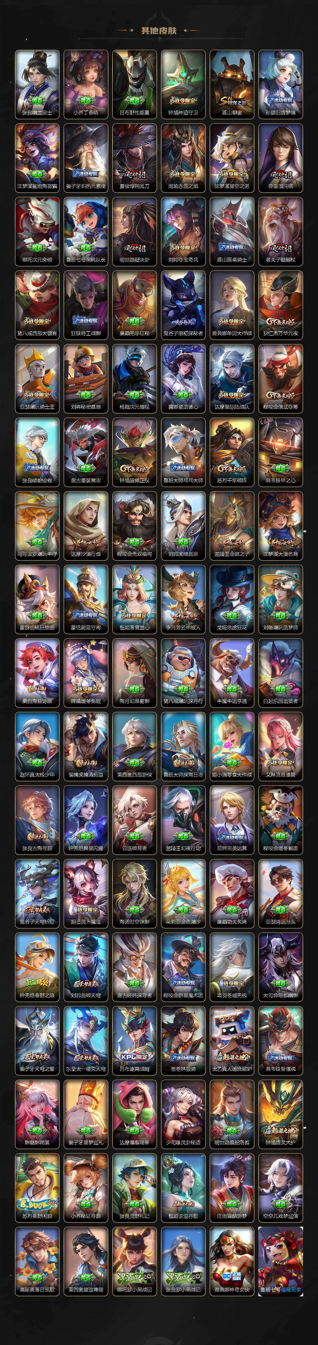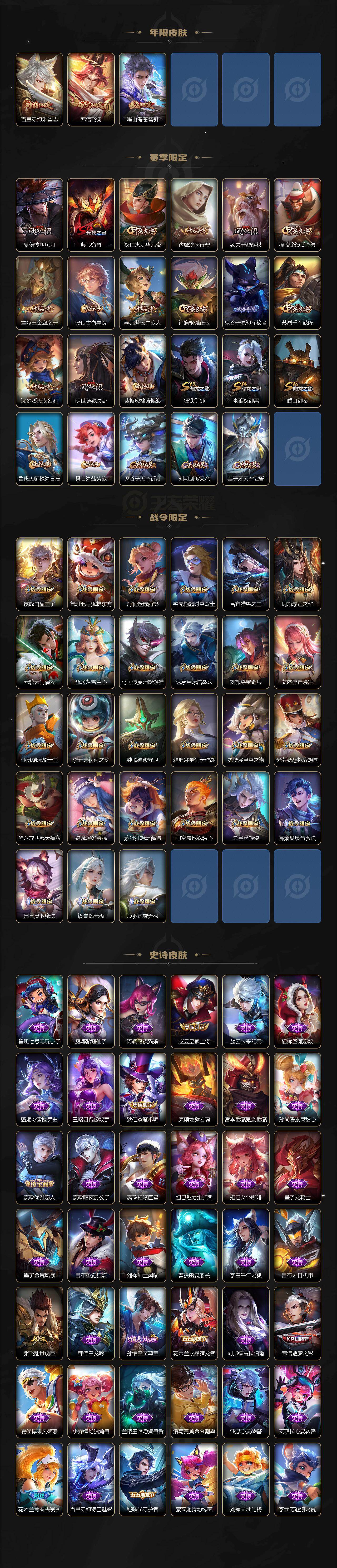 【限定皮肤】:姜子牙天穹之誓,狄仁杰阴阳师,赵云皇家上将,嬴政优雅恋人,嬴政白昼王子,鲁班七号狮舞东方,庄周高山流水,阿轲迷踪丽影,钟无艳超时空战士,吕布猎兽之王,周瑜赤莲之焰,元歌云间偶戏,元歌无心,夏侯惇朔风刀,甄姬落雪兰心,曹操天狼征服者,典韦穷奇,马可波罗暗影游猎,狄仁杰魔术师,狄仁杰万华元夜,达摩星际陆战队,达摩沙漠行僧,项羽海滩派对,老夫子醍醐杖,程咬金演武夺筹,刘邦夺宝奇兵,韩信逐梦之影,韩信飞衡,韩信傲雪梅枪,兰陵王金庭之子,花木兰青春决赛季,亚瑟潮玩骑士王,孙悟空至尊宝,孙悟空大圣娶亲,李元芳银河之约,李元芳云中旅人,虞姬启明星使,钟馗神迹守卫,钟馗驱傩正仪,杨玉环遇见飞天,雅典娜单词大作战,蔡文姬繁星吟游,鬼谷子原初探秘者,鬼谷子五谷丰年,诸葛亮武陵仙君,苏烈千军破阵,百里守约朱雀志,弈星混沌棋,沈梦溪星空之诺,沈梦溪大漠名商,明世隐疑决卦,裴擒虎天狼狩猎者,裴擒虎李小龙,裴擒虎擒涛扼浪,狂铁御狮,米莱狄御霄,米莱狄胡桃异想国,云中君纤云弄巧,盾山御銮,猪八戒西部大镖客,上官婉儿梁祝,嫦娥拒霜思,嫦娥暖冬兔眠,曜山海苍雷引,蒙犽狂想玩偶喵,鲁班大师探海日志,镜匿光追影者,桑启海盐诗旅,暃星界游侠,艾琳流音漫舞,司空震地狱燃心,阿古朵江河有灵,张良古海寻踪,蒙犽百解令,高渐离燃音魔法,妲己灵卜魔法,鬼谷子天穹祈灯,姬小满妄想食味,刘邦剑破天穹,程咬金群星魔术团,镜青焰无极,项羽苍威无极