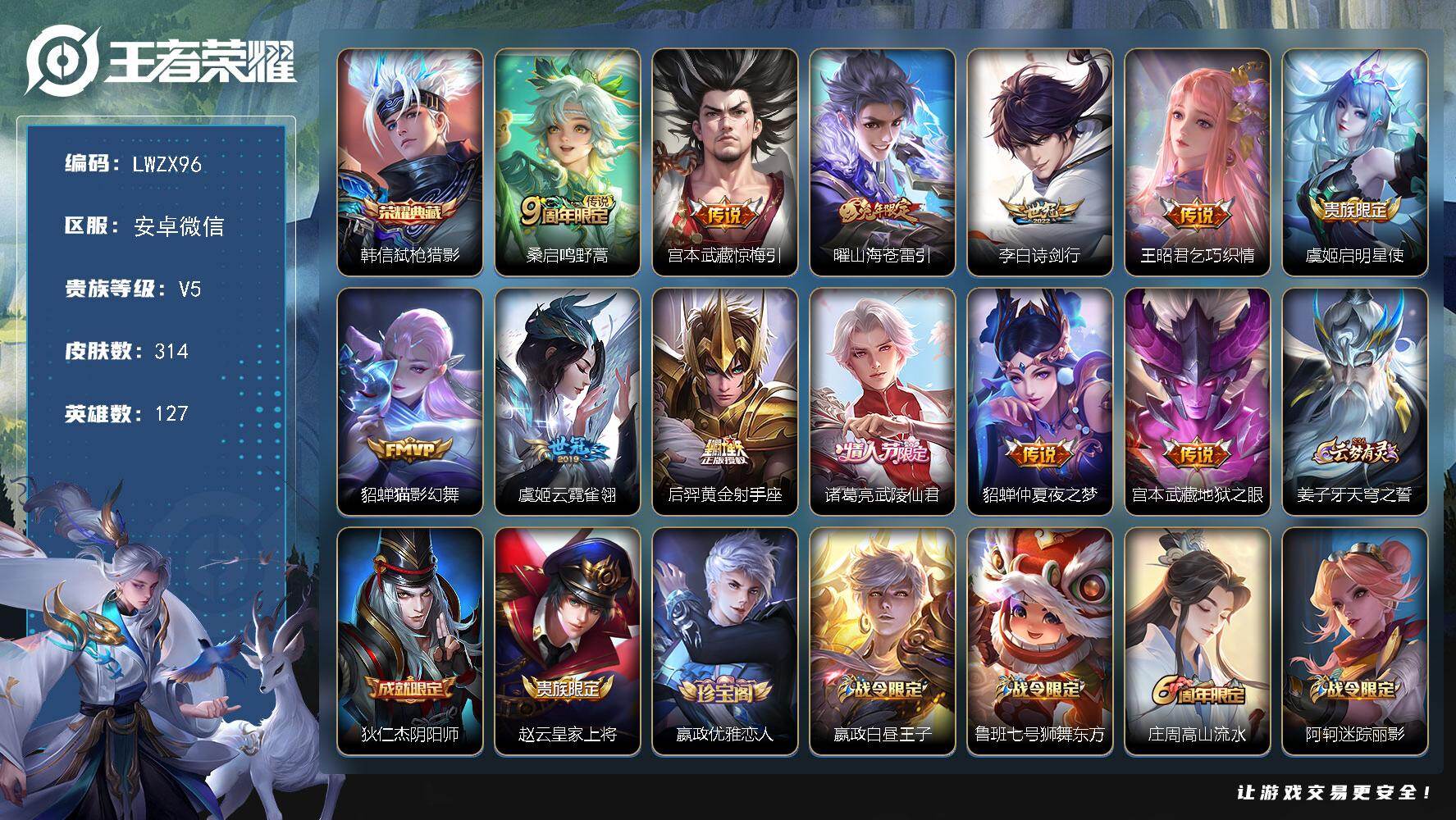 [15580105]【特价出售/店主推荐】安卓WX-V5-永恒钻石IV段位-127英雄-314皮肤-1典藏皮肤-12传说-93史诗
